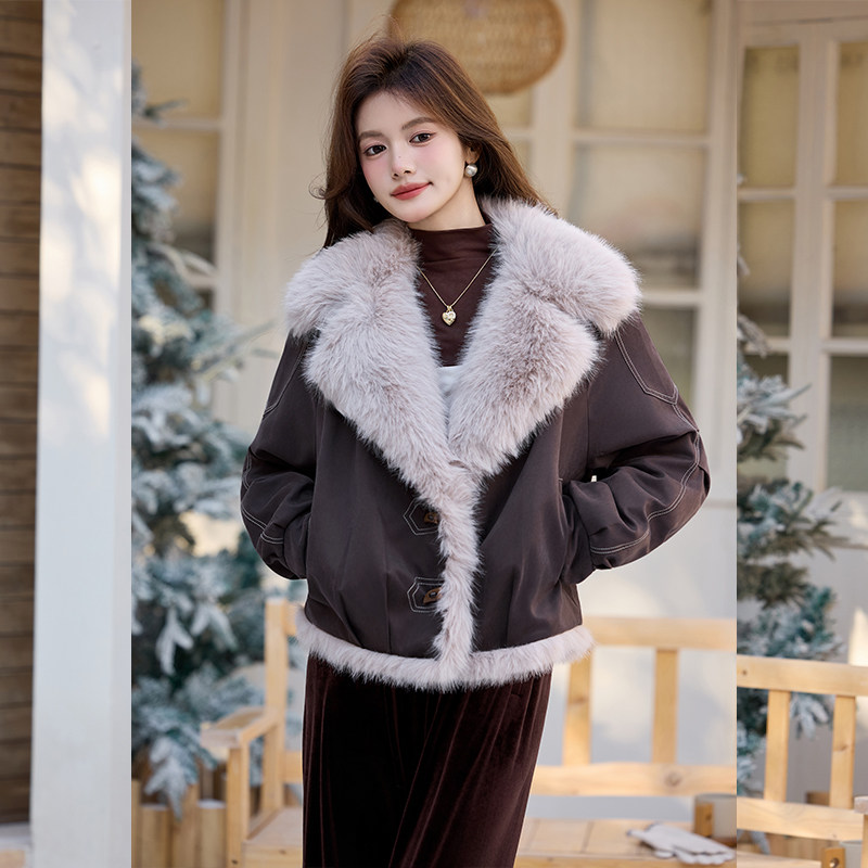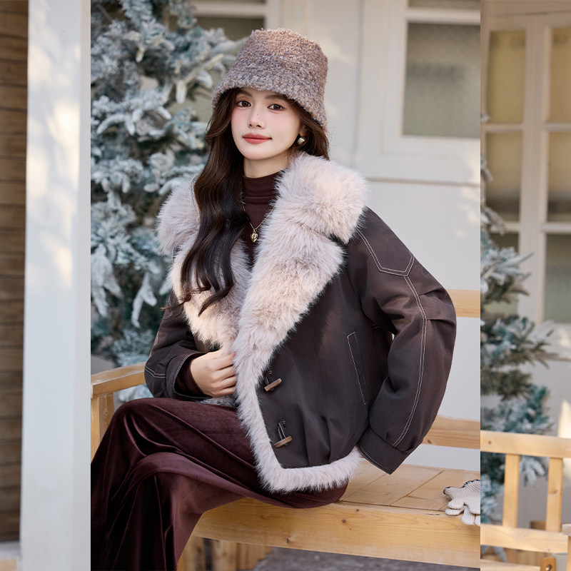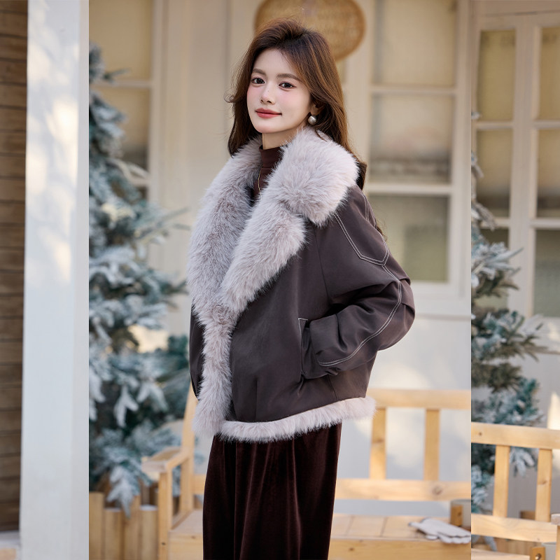 白鹿语复古机车大毛领仿皮草外套25秋冬新款 设计感加厚保暖夹克