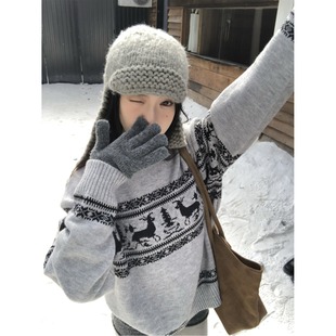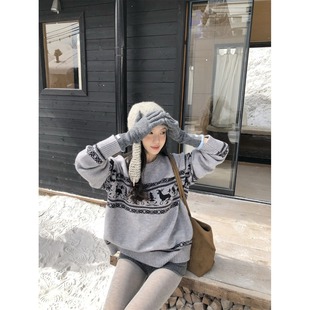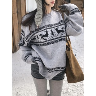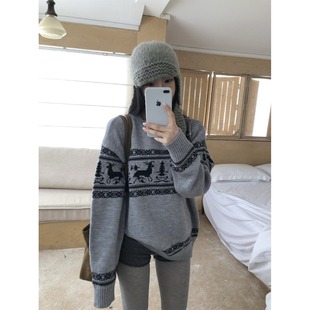 毛衣 秋冬费尔岛复古提花毛衣麋鹿图案针织衫 黑奶酪 BLACK