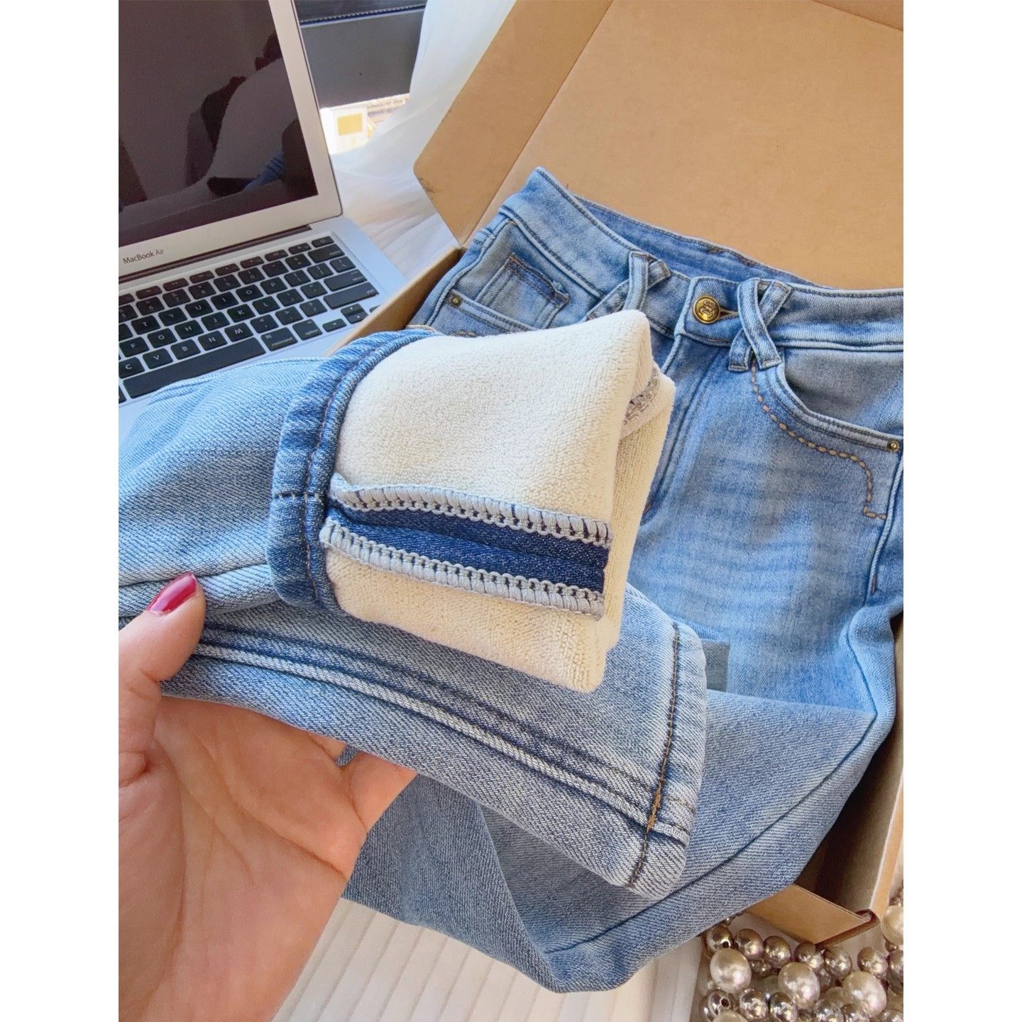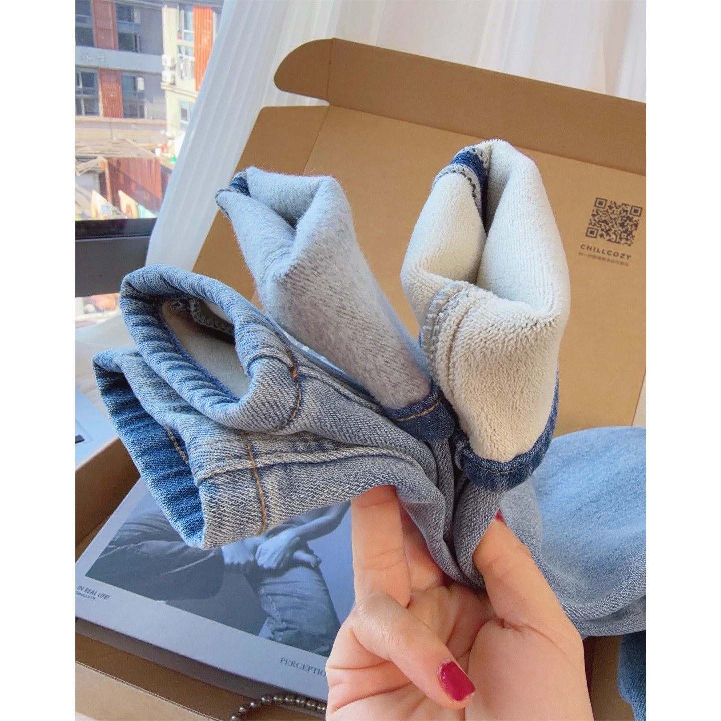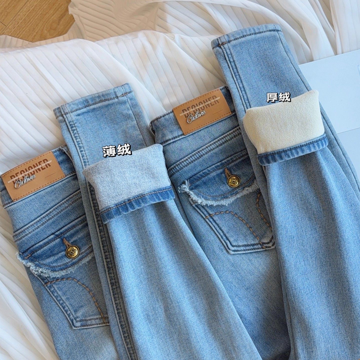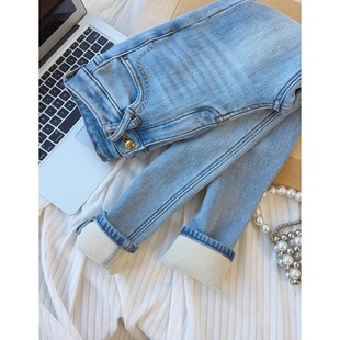 女冬厚绒高腰弹力显瘦紧身九分小脚裤 小个子靴裤 浅色加绒牛仔裤