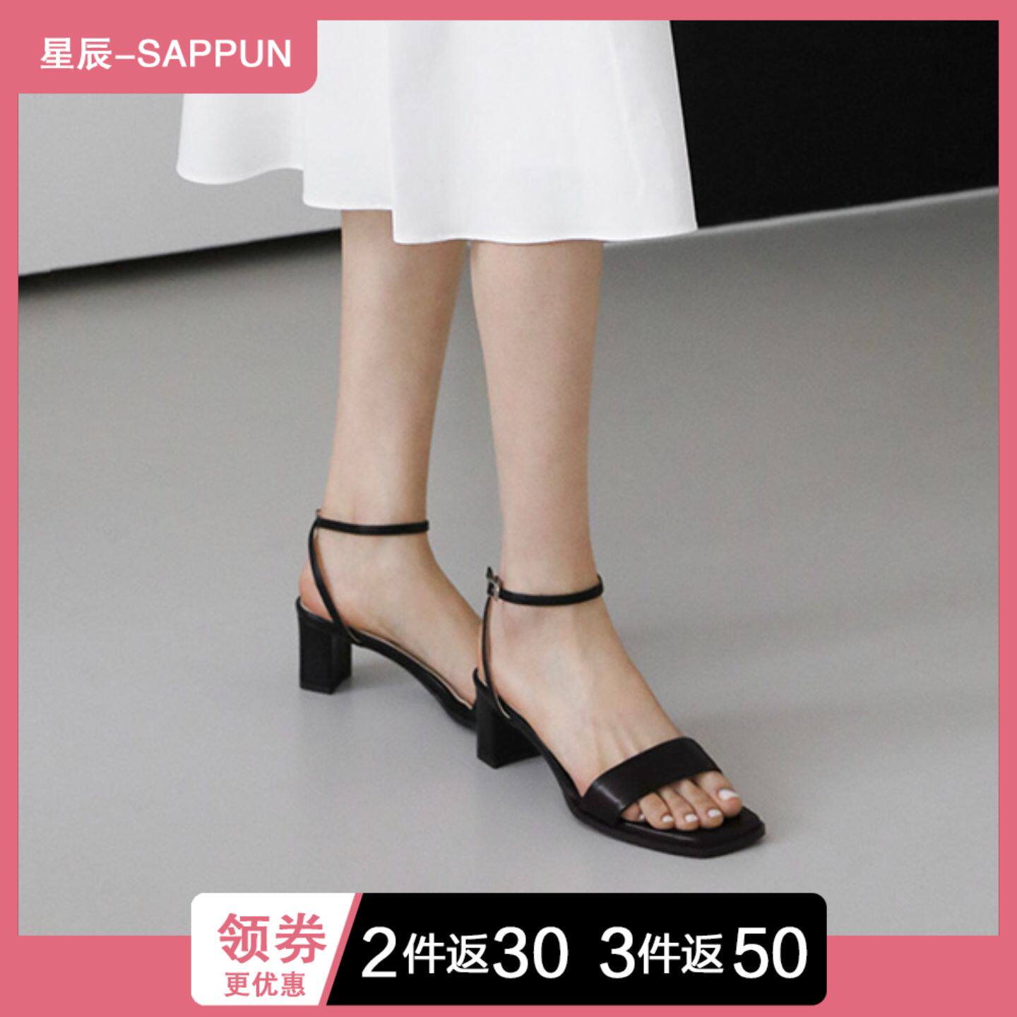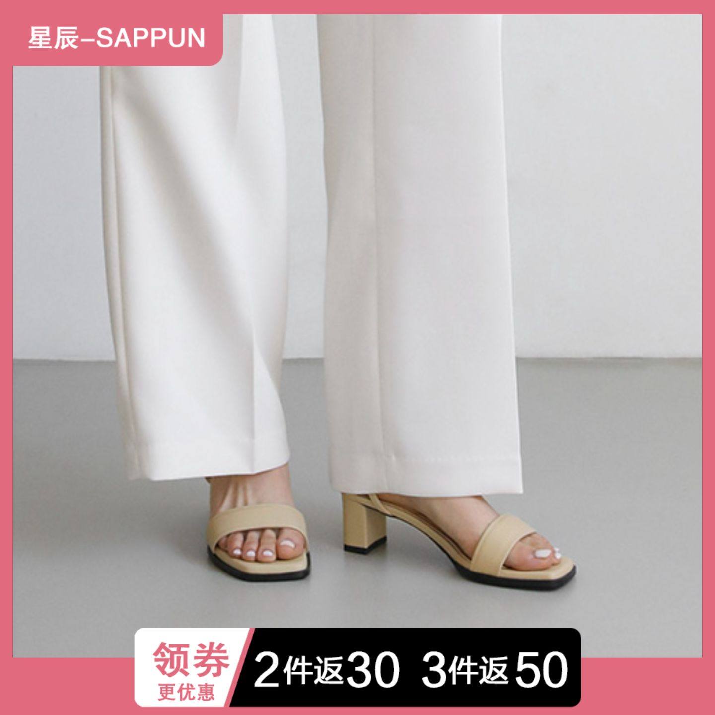 星辰韩国代购 SAPPUN 高跟凉鞋 通勤露趾一字带方头粗跟 简约时尚