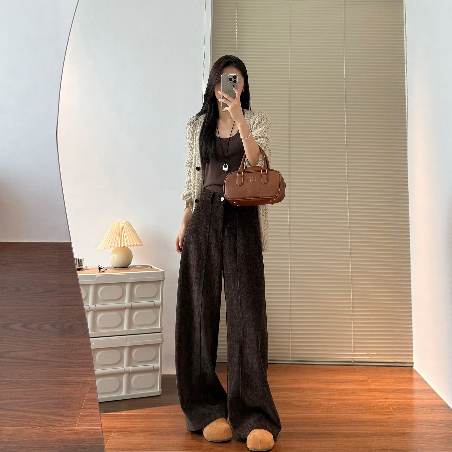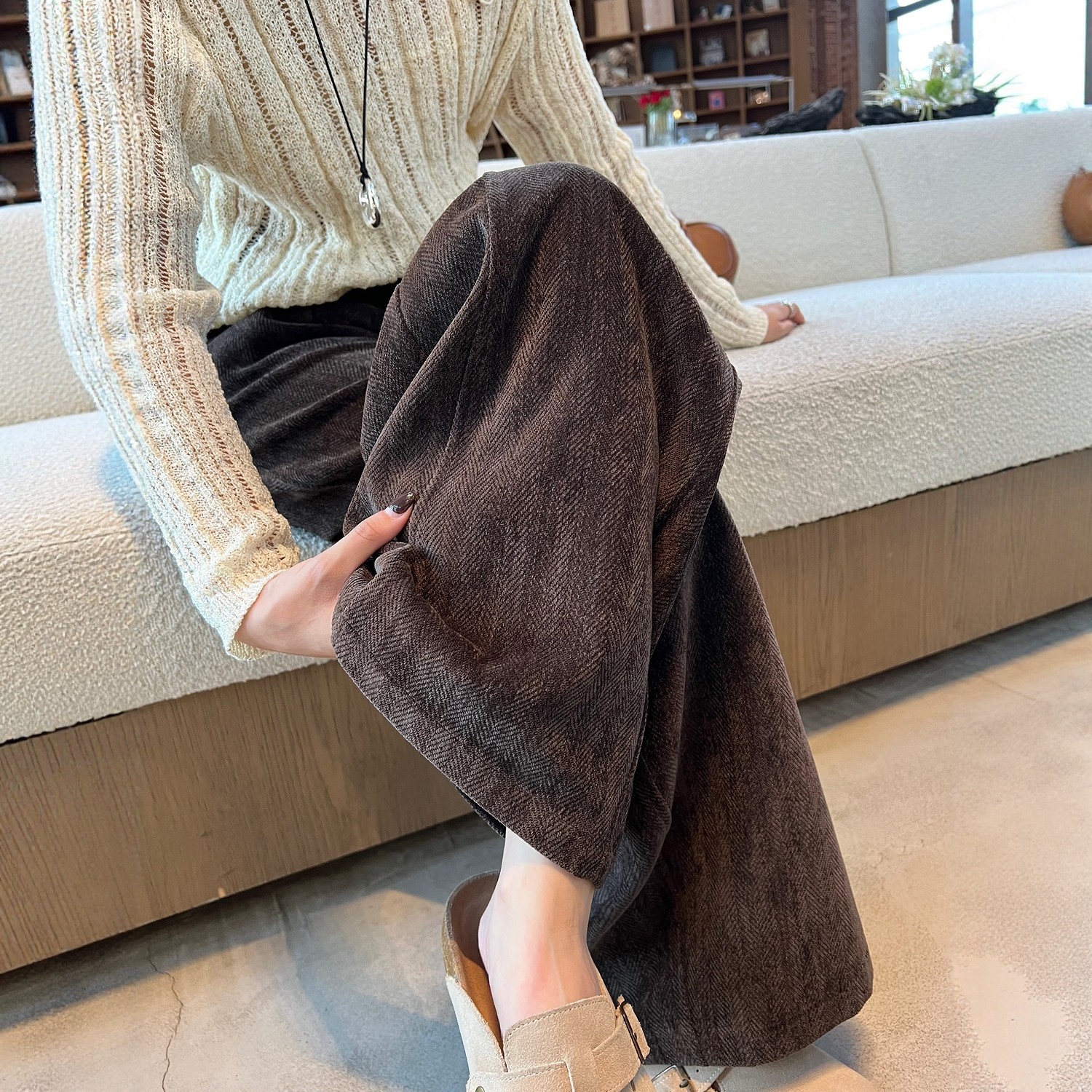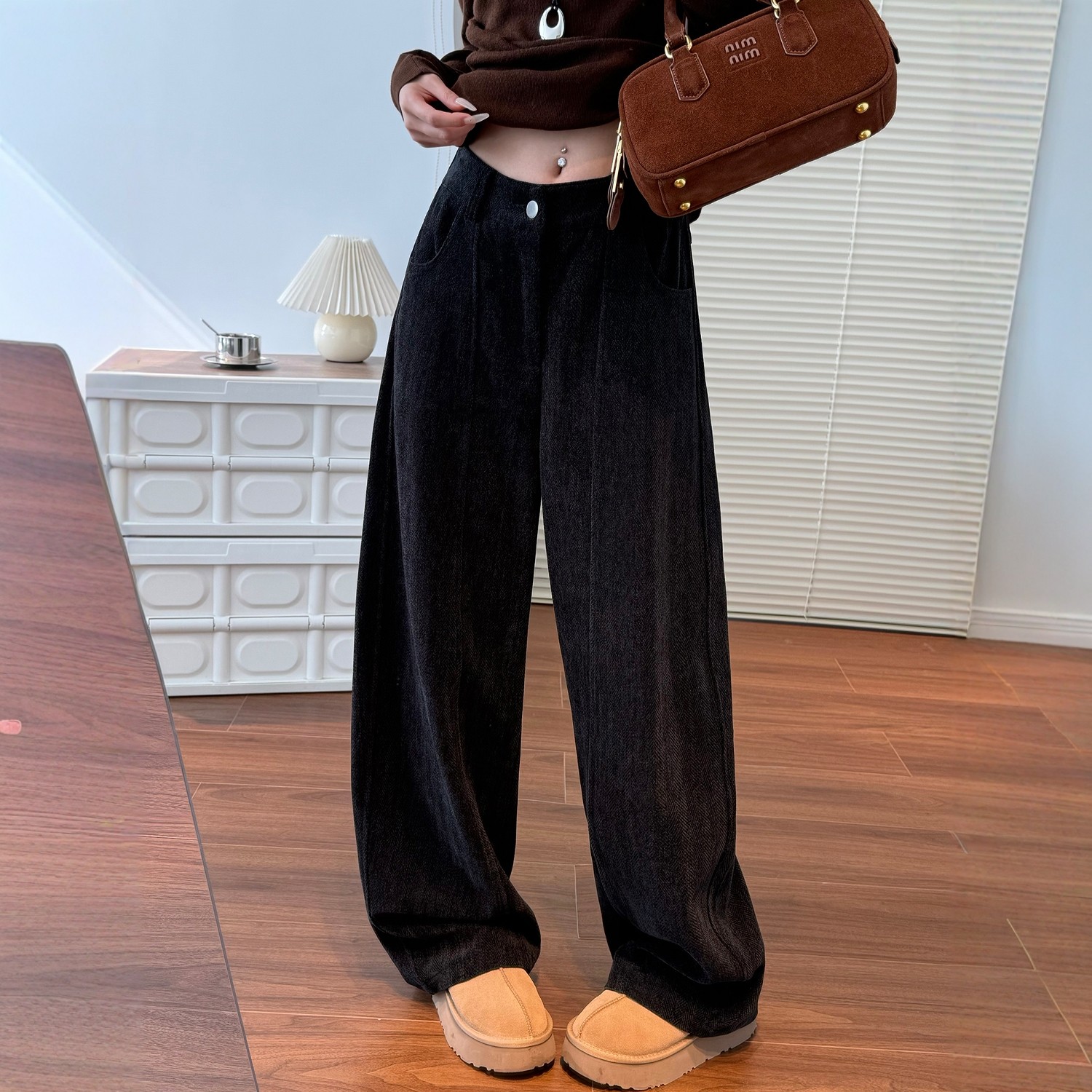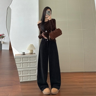 子 垂感老钱风直筒人字纹灯芯绒裤 黑色雪尼尔阔腿裤 女2025秋冬新款