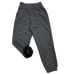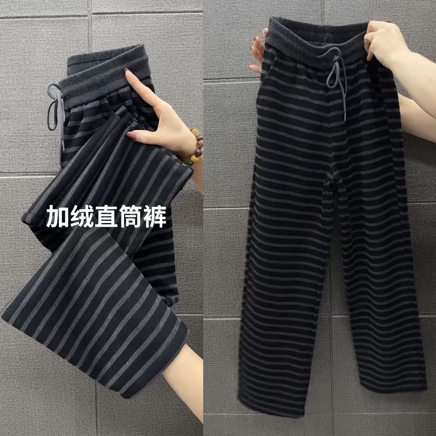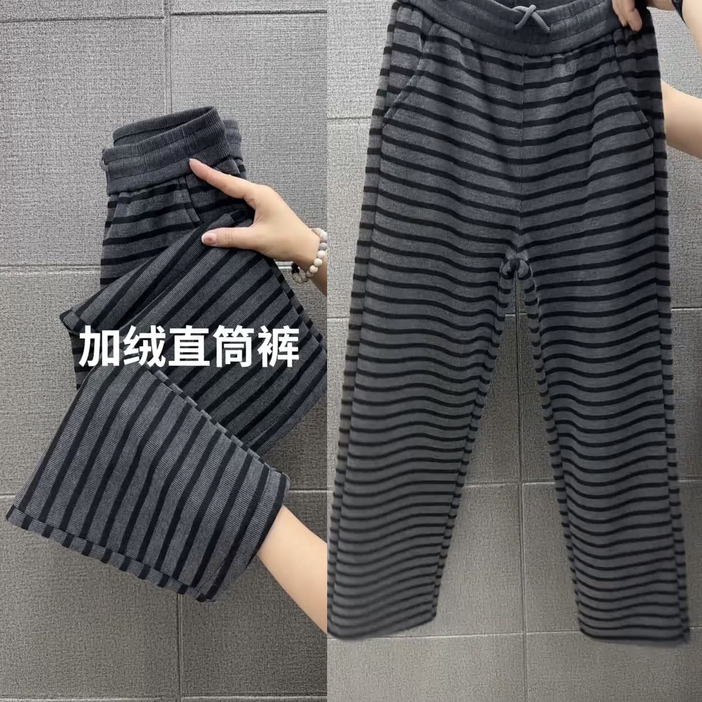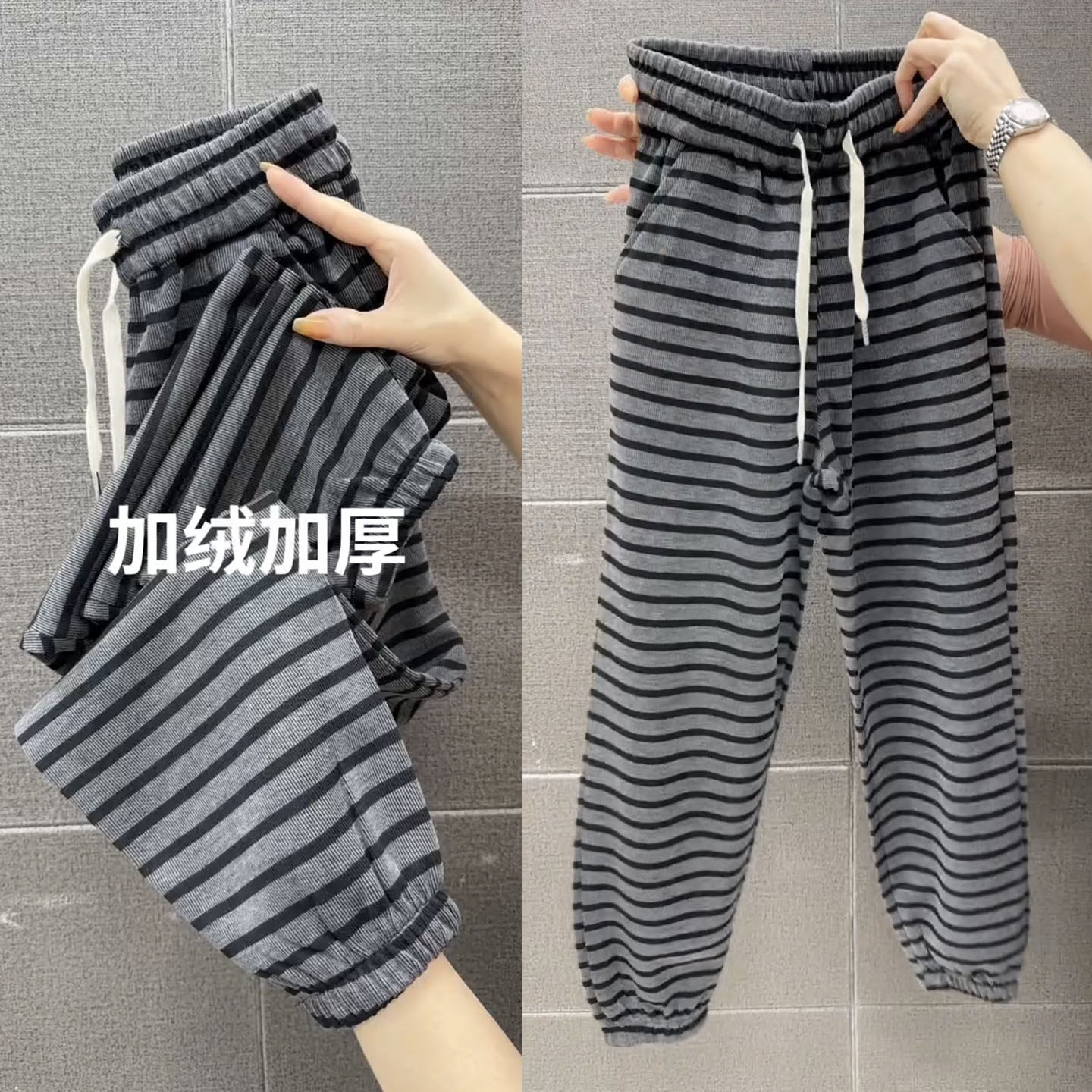 女保暖黑色条纹休闲裤 欧货冬季 高腰束脚萝卜裤 加绒加厚哈伦裤 新款