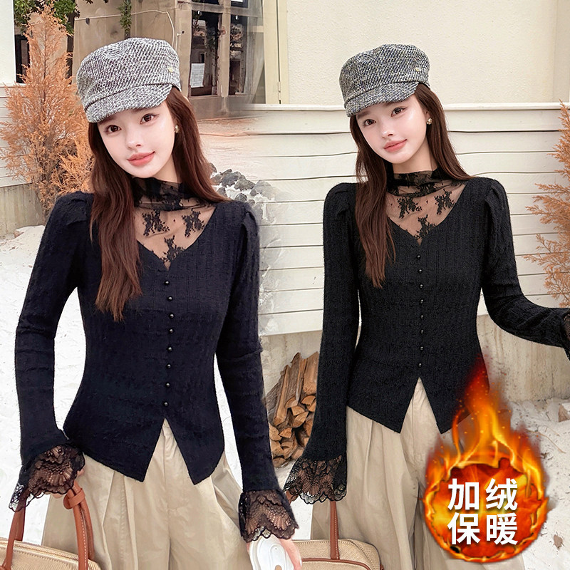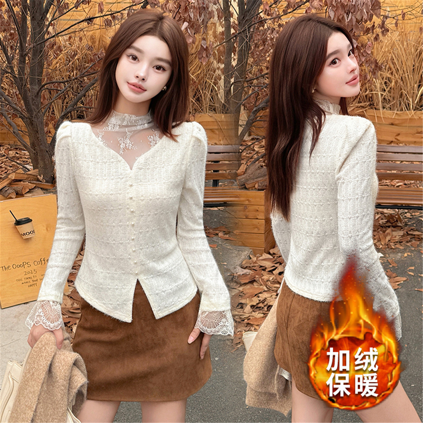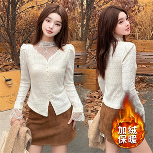 女白色设计感小众上衣T秋冬加绒打底衫 针织衫 蕾丝拼接喇叭袖 法式