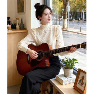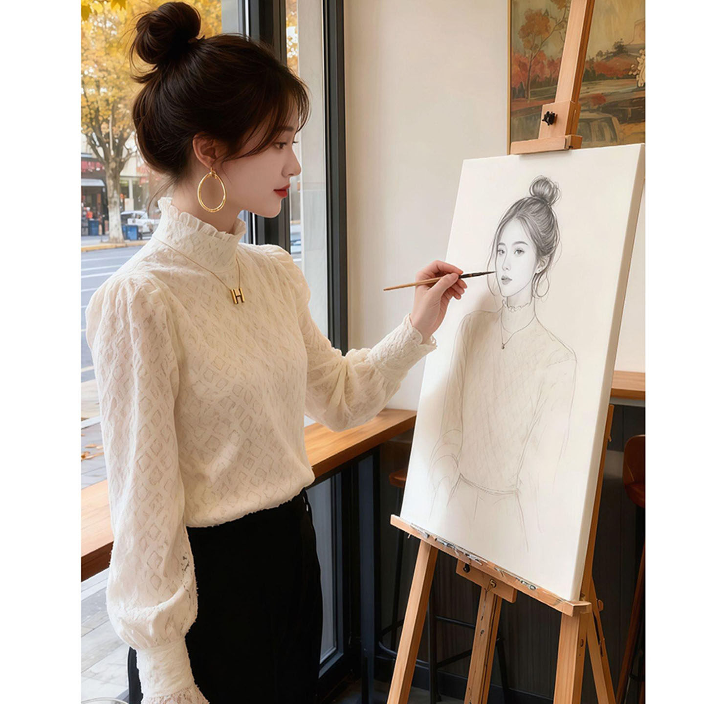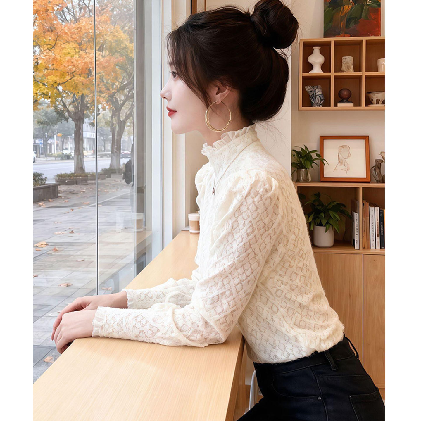 气质内搭小衫 加绒半高领长袖 法式 女秋冬新款 显瘦上衣潮 蕾丝打底衫
