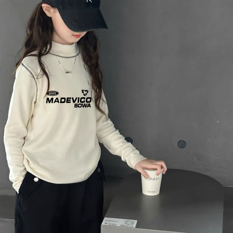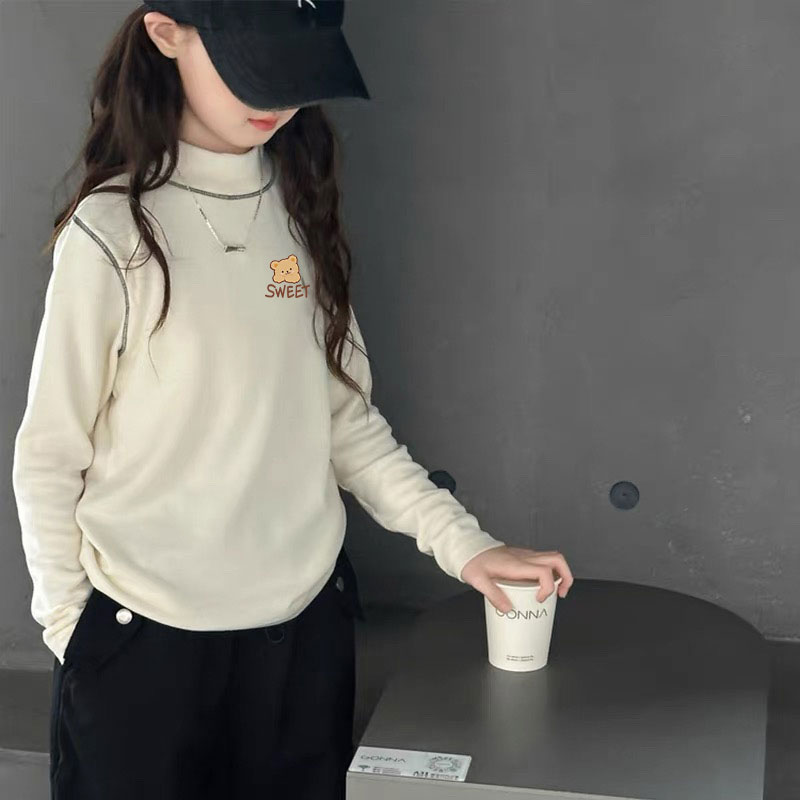T恤上衣2025新款 女童半高领打底衫 秋冬内搭中大童米色薄绒长袖