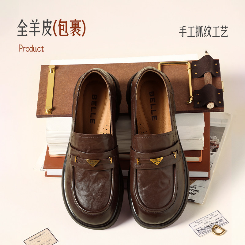 深口单鞋 百丽元 复古英伦风羊皮黑色小皮鞋 女新款 E9L1DA预 宝乐福鞋