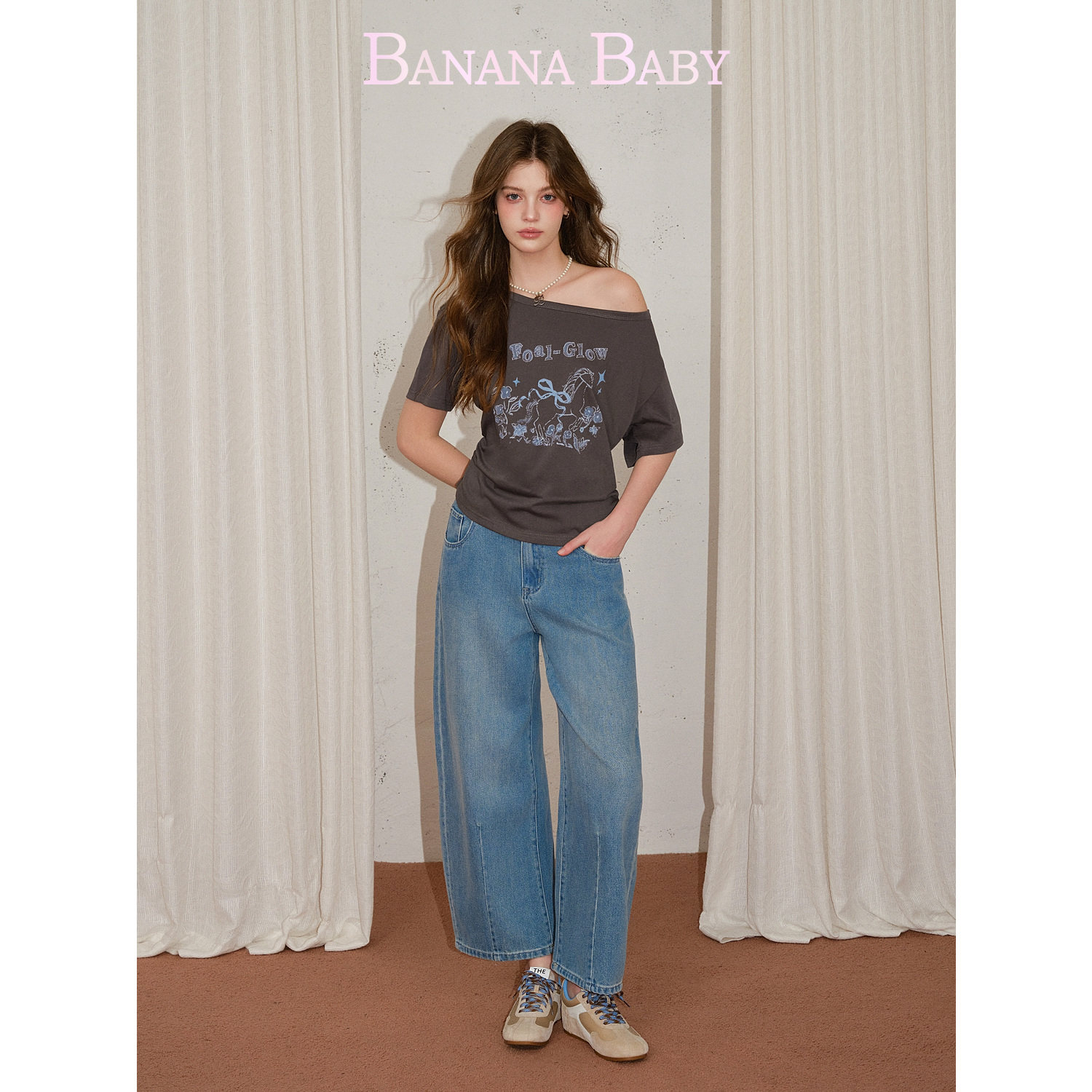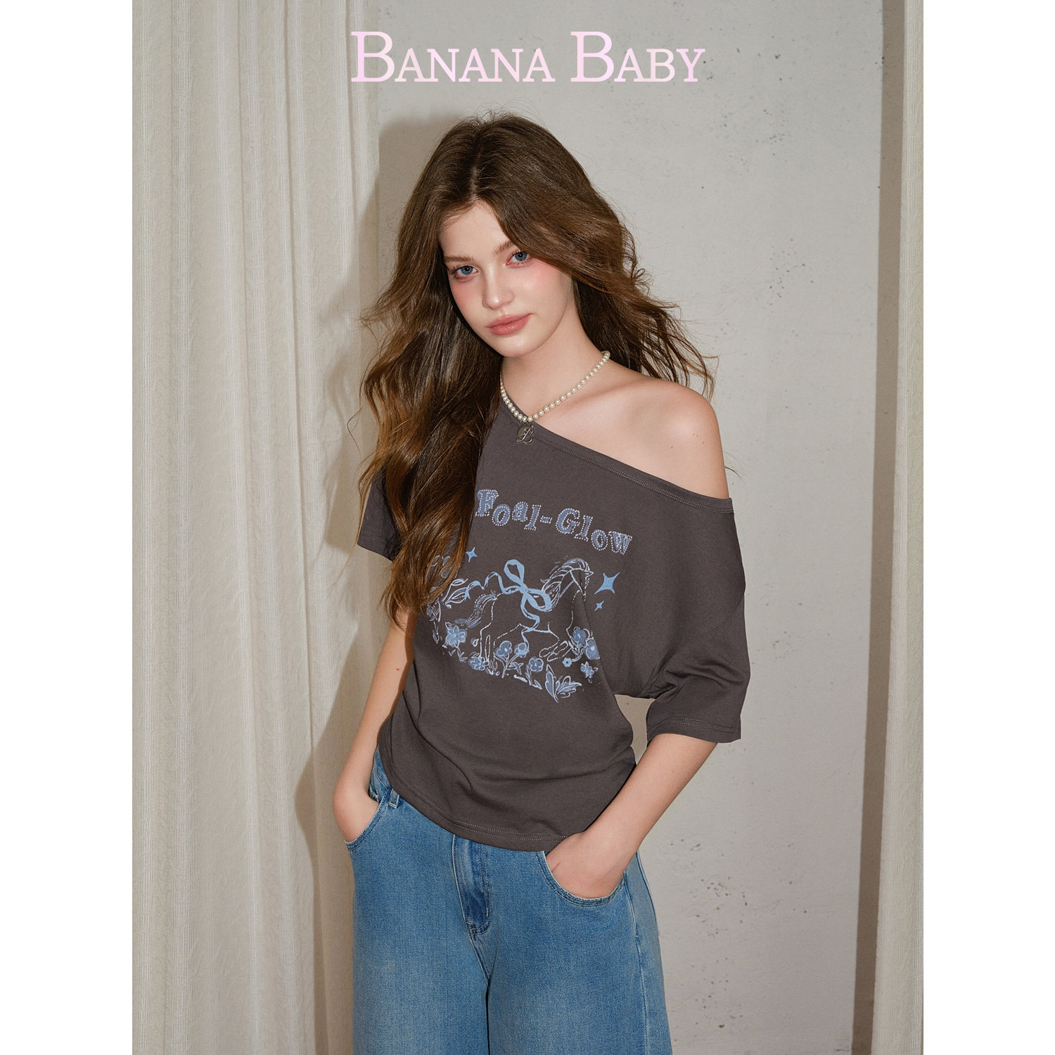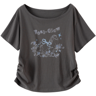 T恤女 油画感花朵小马印花一字肩斜肩短袖 BANANA BABY2026年夏新款