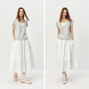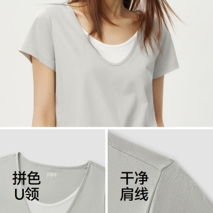气质简约风时尚 棉麻假两件拼色U领2026新款 衣服 T恤女夏季 森马短袖