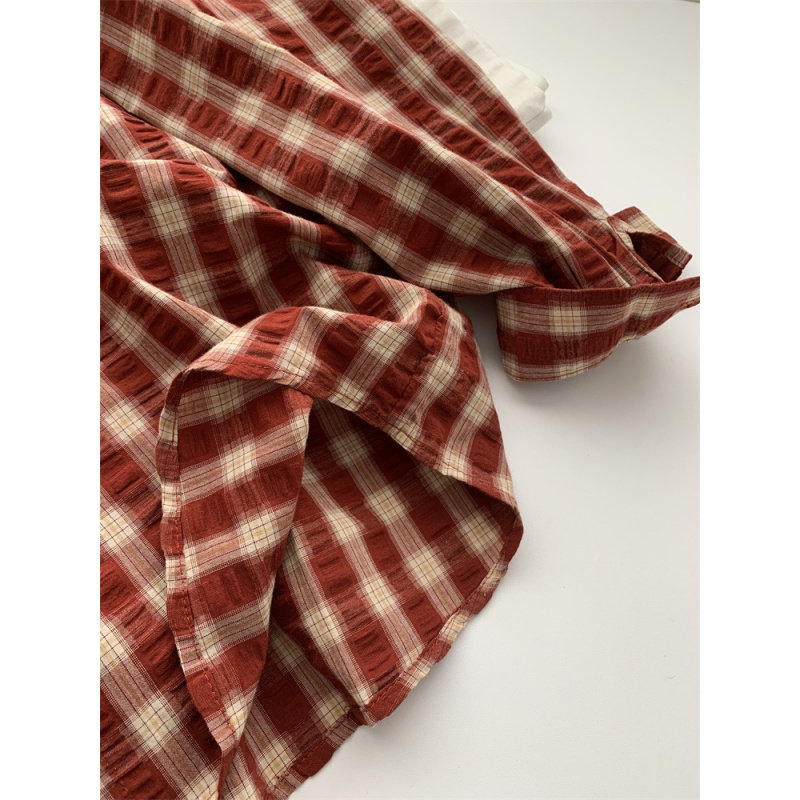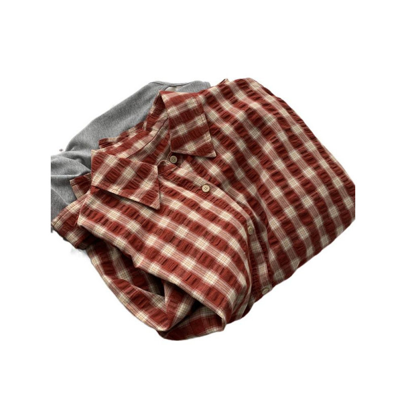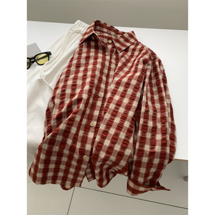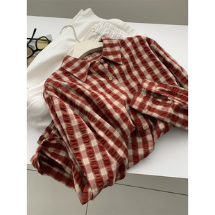 空调衫 气质显白通勤百搭春秋叠穿外搭衬衣泡泡棉红格子衬衫 女开衫