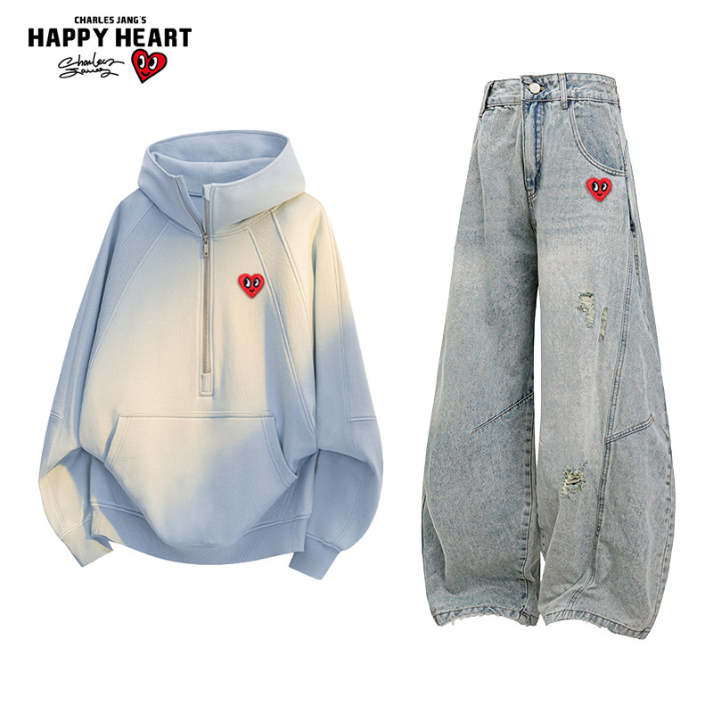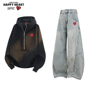 情侣破洞弯刀牛仔长裤 男秋季 连帽拉链卫衣休闲套装 查尔斯桃心美式