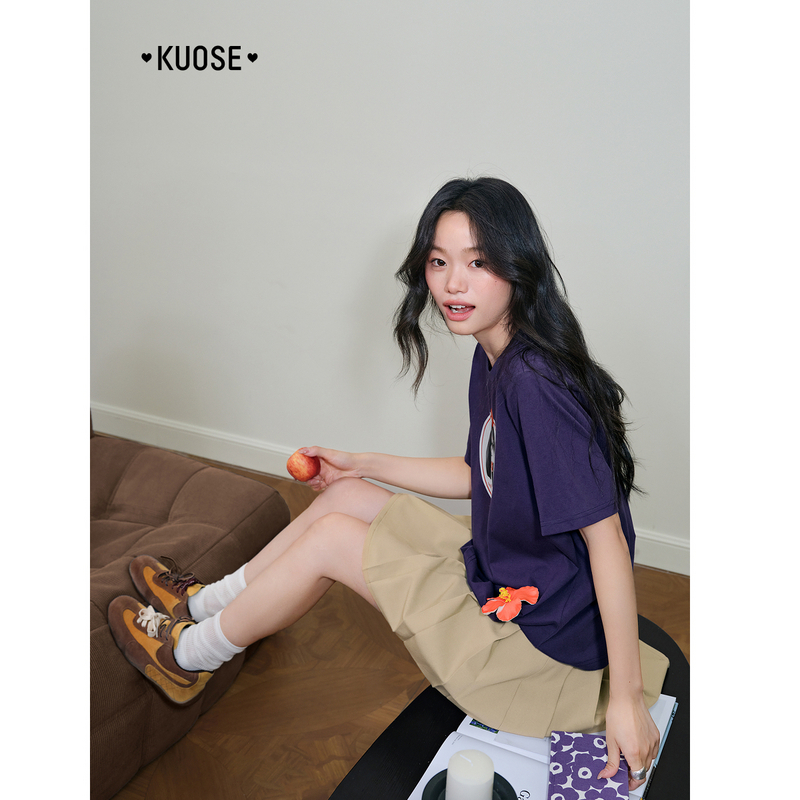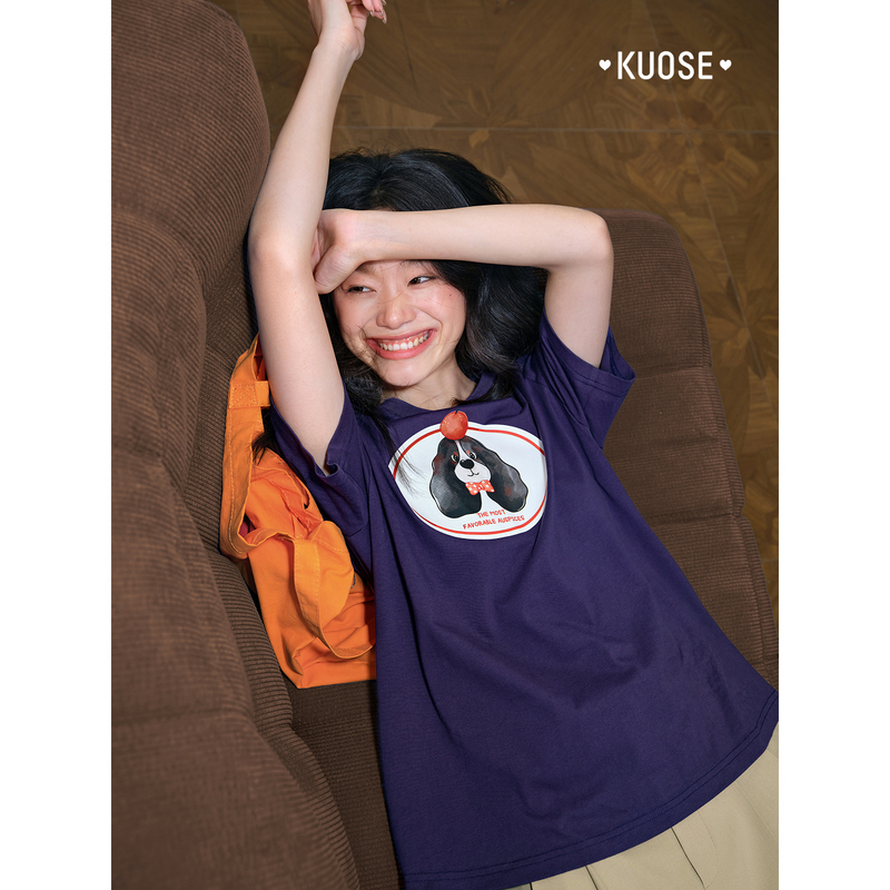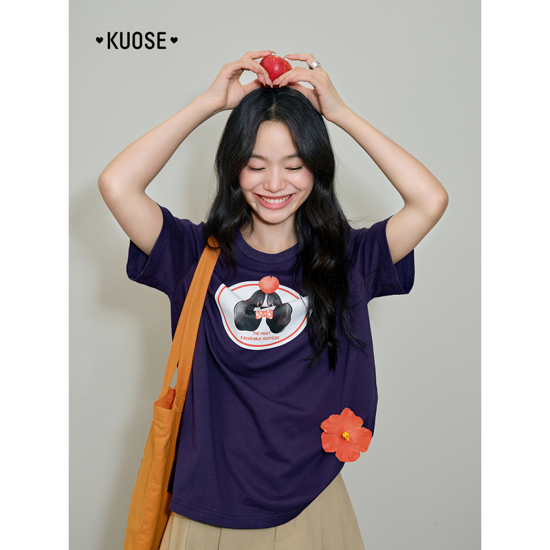 印花宽松半袖 阔色深紫色圆领休闲短袖 新款 2025秋季 上衣 t恤女夏装