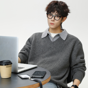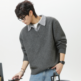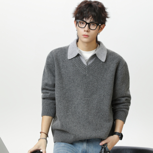 冬装 男士 翻领羊毛针织衫 衣服英伦雅痞男装 上衣 假两件灰色毛衣冬季