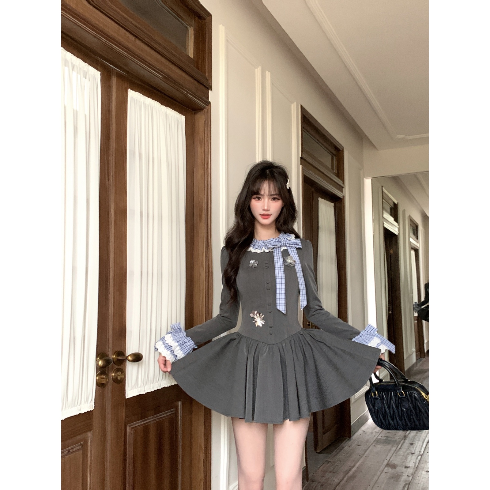 千金风蝴蝶结拼接格子立体亮片重工连衣裙 法式 越韩小鱼 伦敦之夜