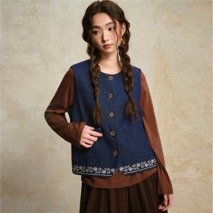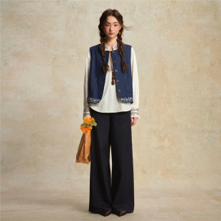撞色绣花下摆圆领牛仔马甲外套女18375815 新款 设计师款 佐丹奴春季
