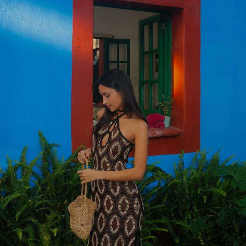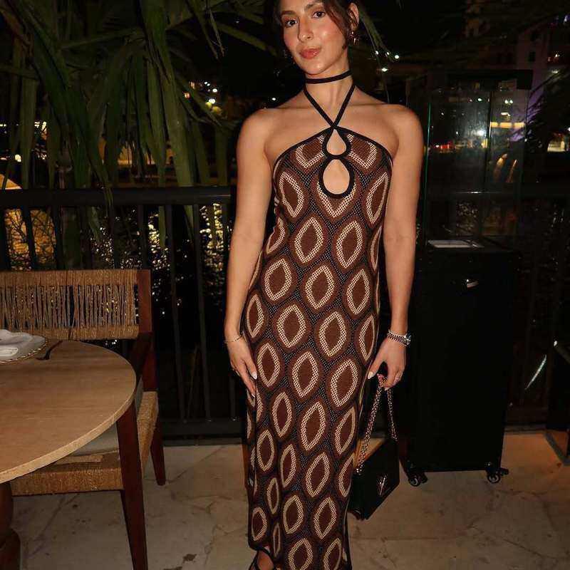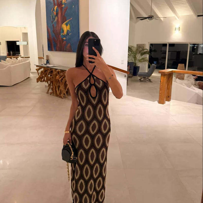 wildgirl波西米亚度假风针织镂空开叉沙滩挂脖露背包臀长款 连衣裙