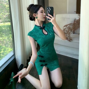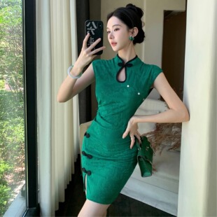 包臀连衣裙夏 复古绿色显瘦开叉短款 新中式 改良日常旗袍小个子女装