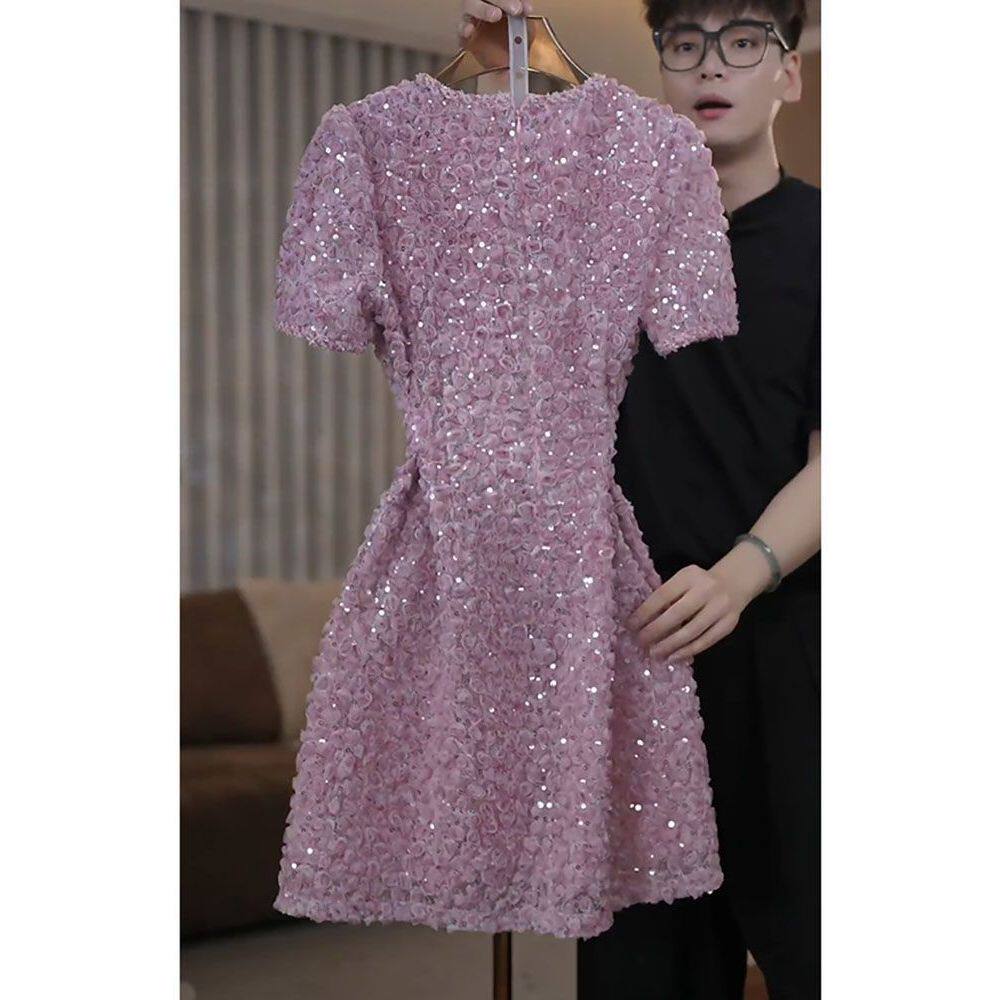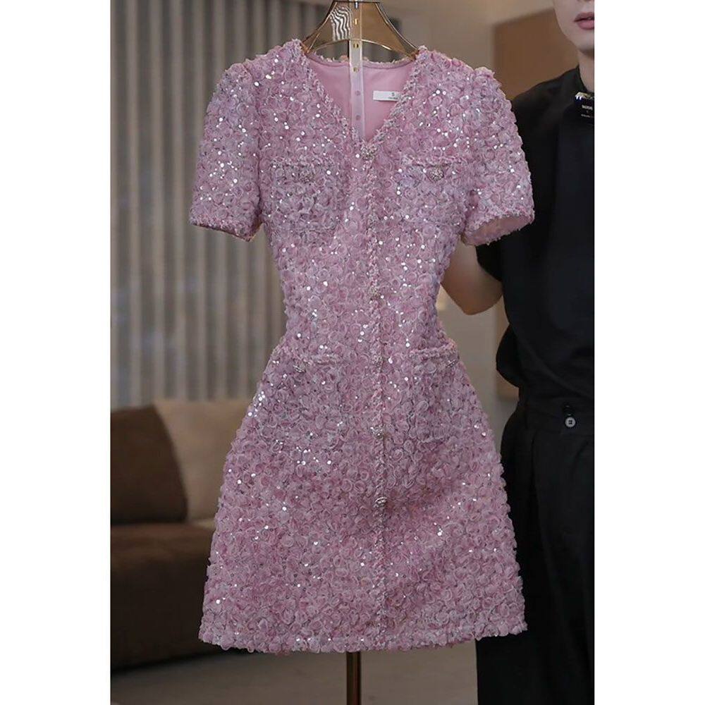 轻奢洋气潮流显瘦A字裙 新款 时尚 减龄重工亮片V领连衣裙女2026夏季