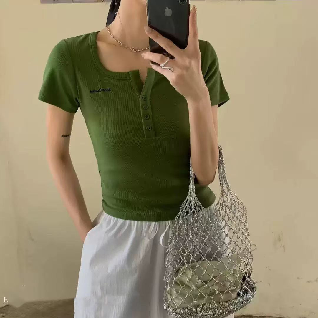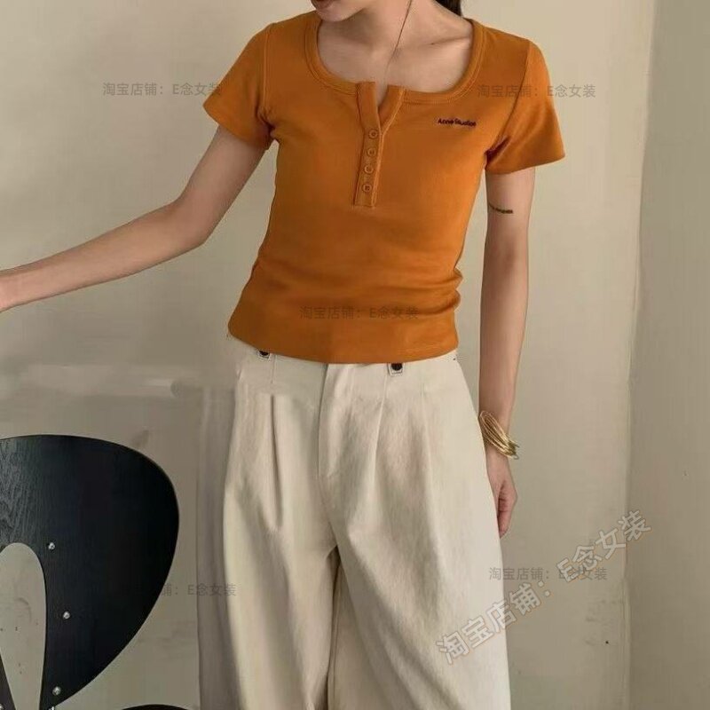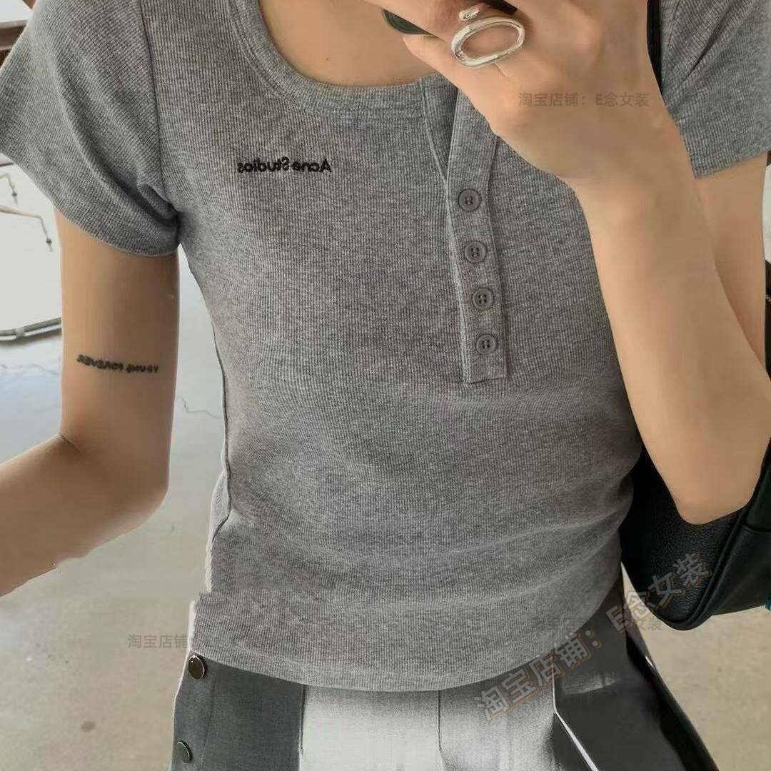 显瘦短款 E念8603短款 高腰修身 U领t恤女春夏新款 百搭白色上衣 短袖
