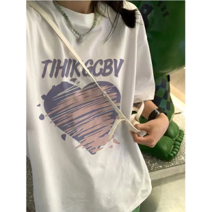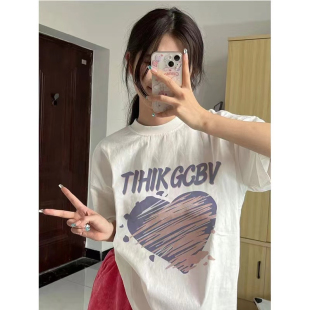 T恤女白色字母印花百搭显瘦上衣夏季 圆领通勤风休闲韩版 宽松短袖