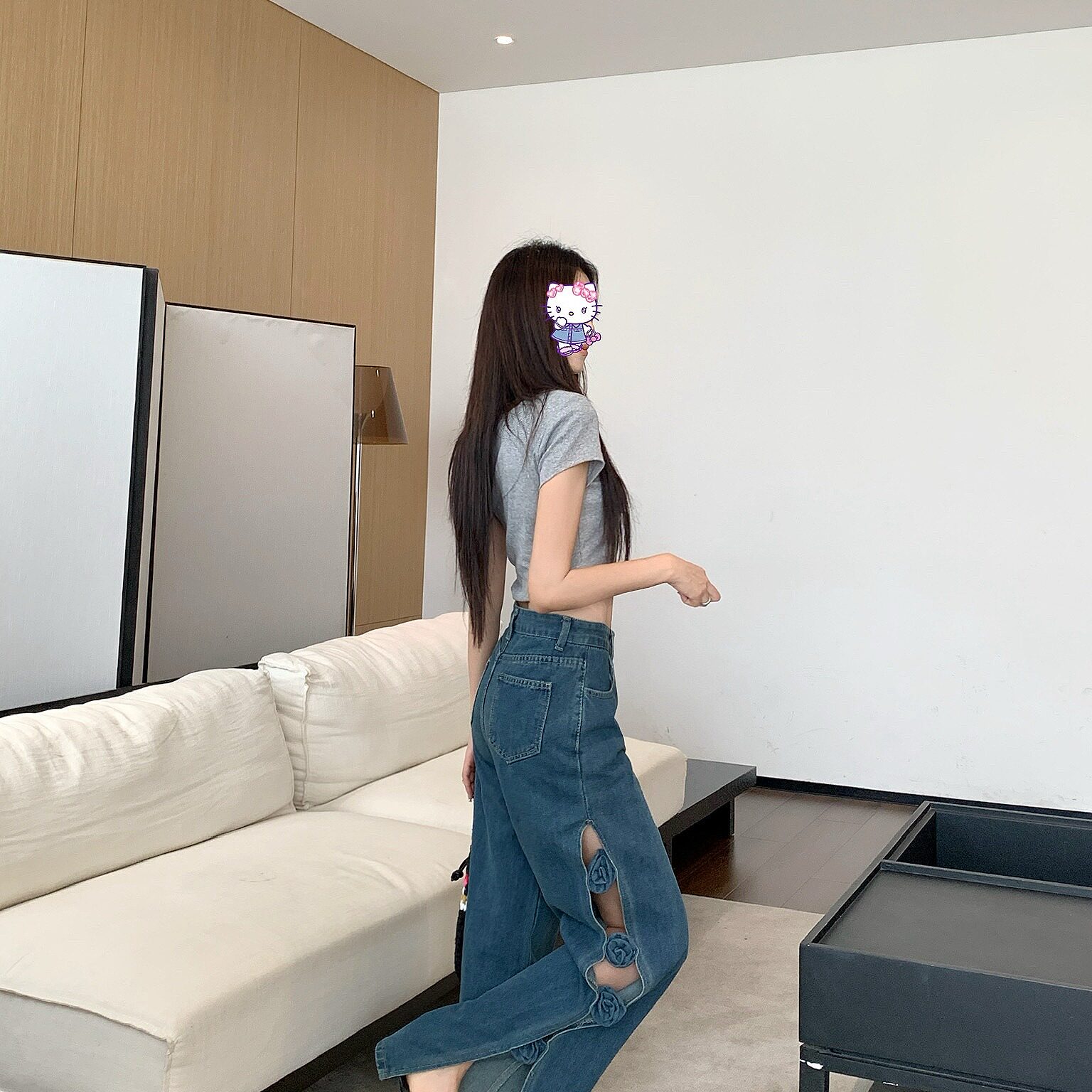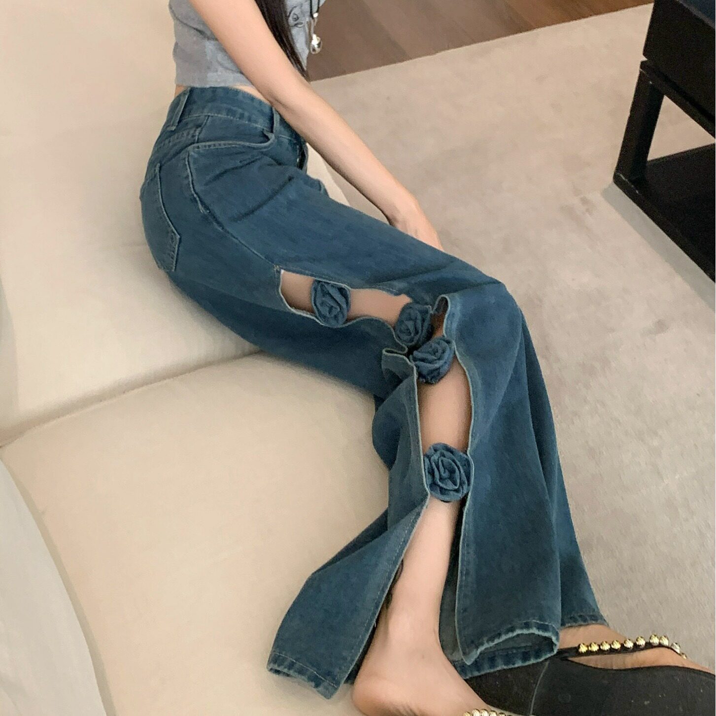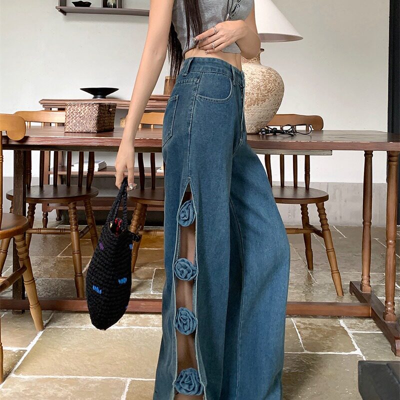 长裤 2026春夏设计感辣妹镂空开叉牛仔裤 手工立体花朵宽松阔腿裤