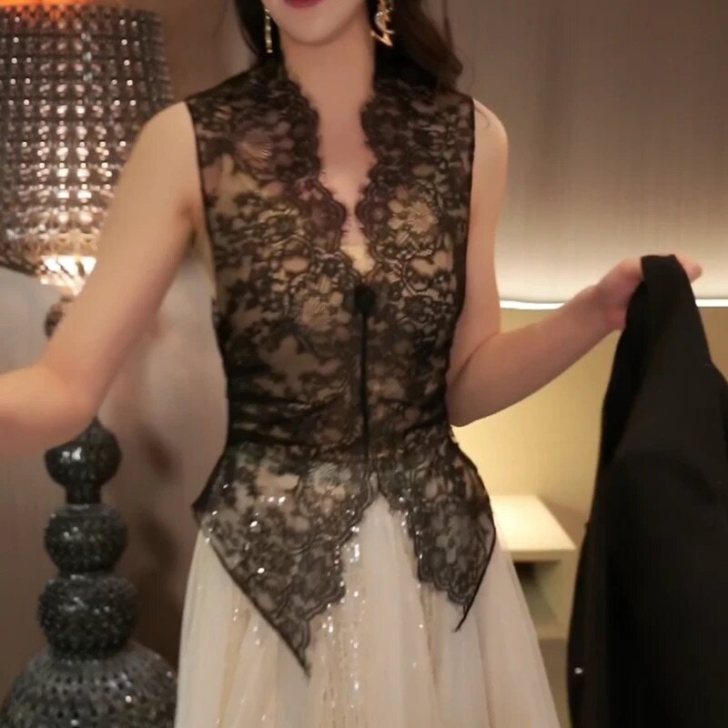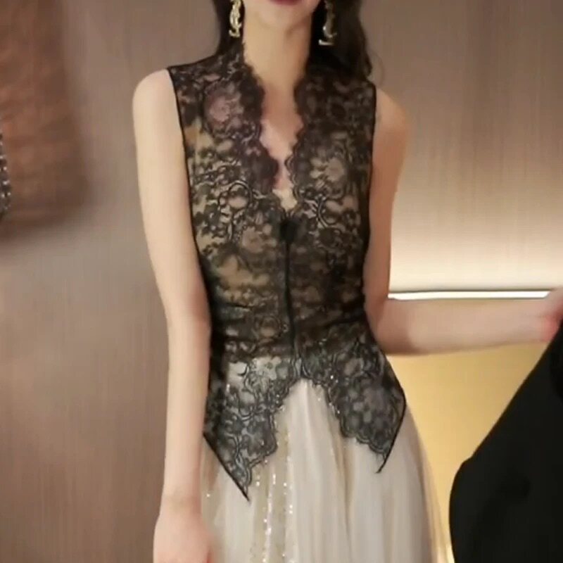 百搭时尚 韩系新款 背心 设计感V领蕾丝马甲背心LK2509962 无袖