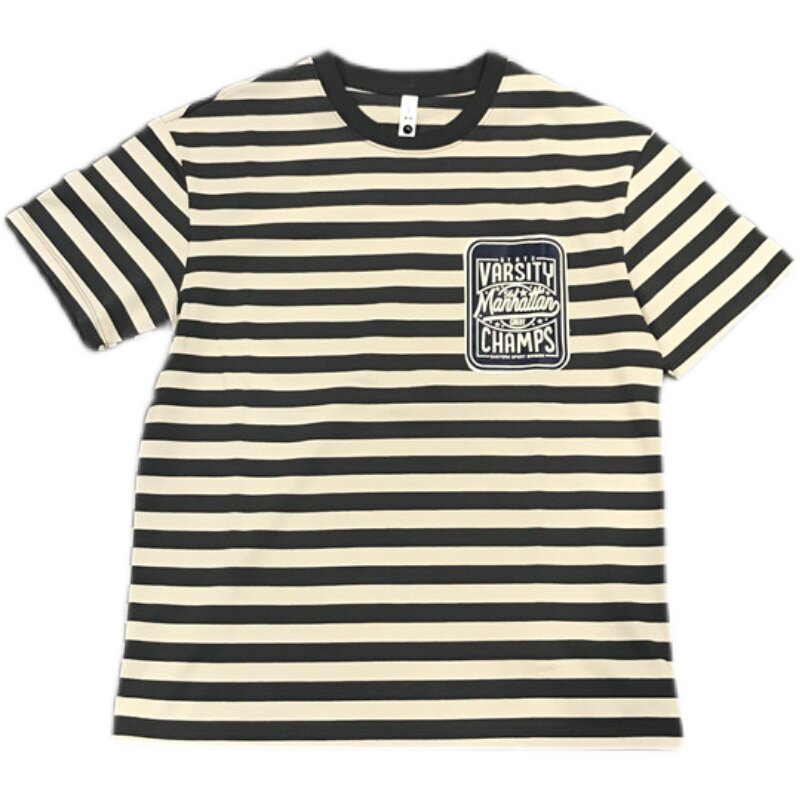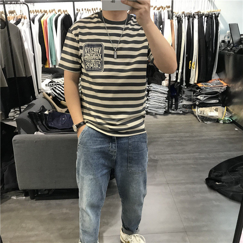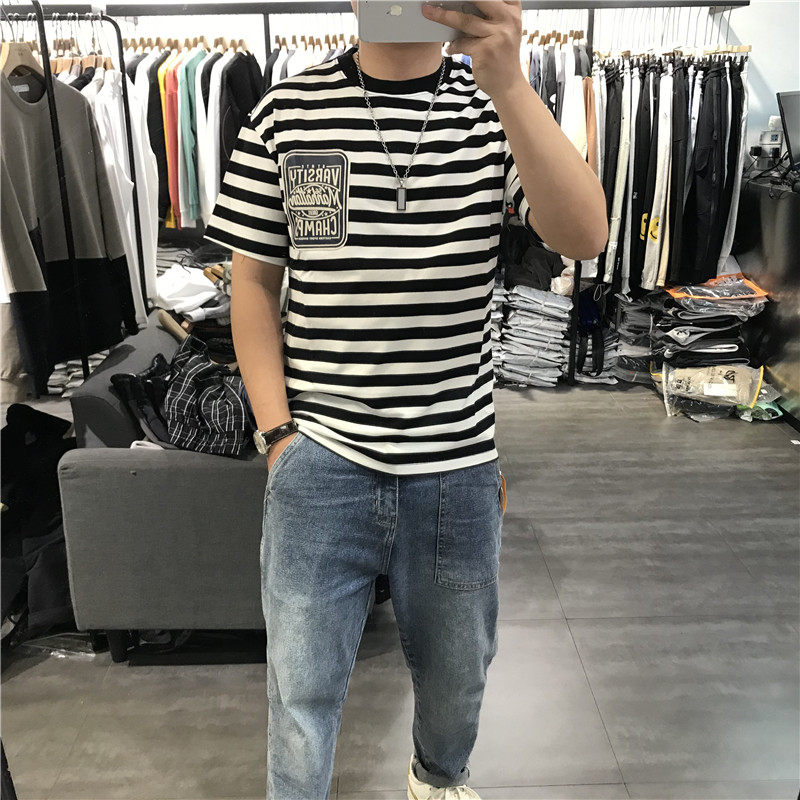T恤宽松个性 2021夏季 条纹短袖 男士 弹力上衣清新文艺海军风潮 新款