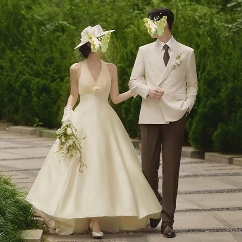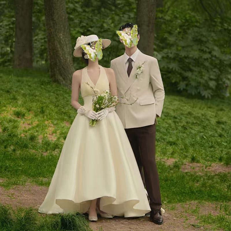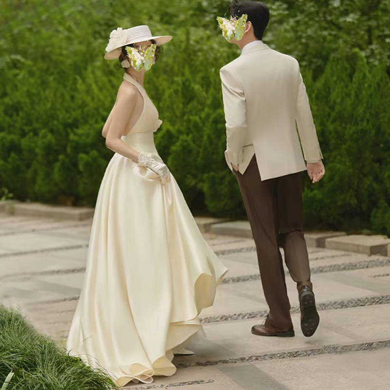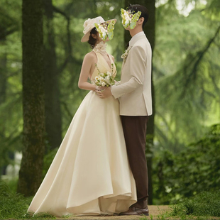 朵拉法式 挂脖轻婚纱新娘简约v领森系结婚晨袍纱香槟色拖尾迎宾纱