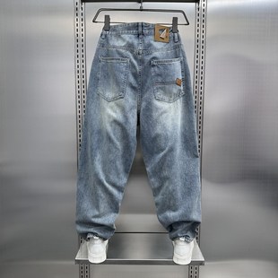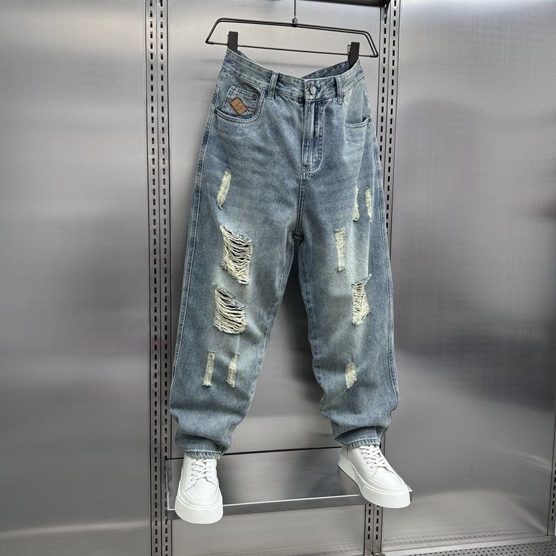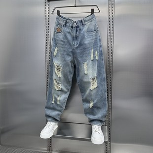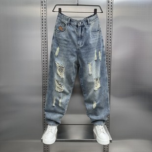 2024夏季 宽松直筒透气九分阔腿哈伦裤 新款 男士 水洗破洞牛仔裤 男裤