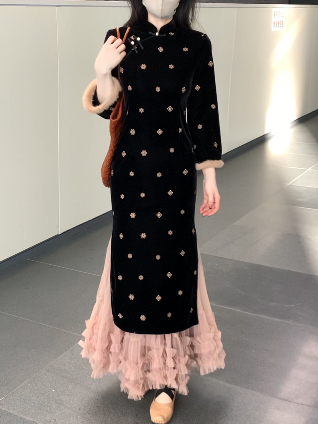 高端长款 黑色丝绒绣花年会战袍主持人晚礼服女 走秀旗袍2025年新款