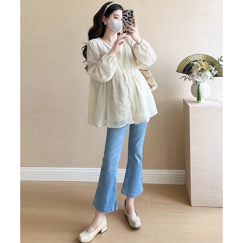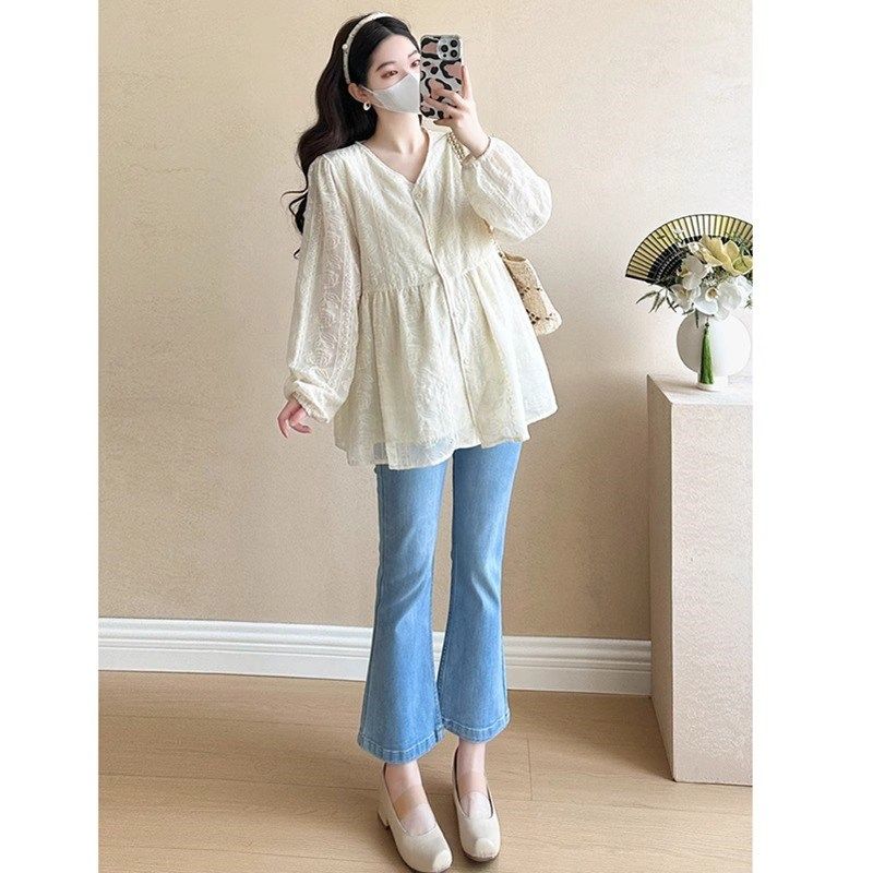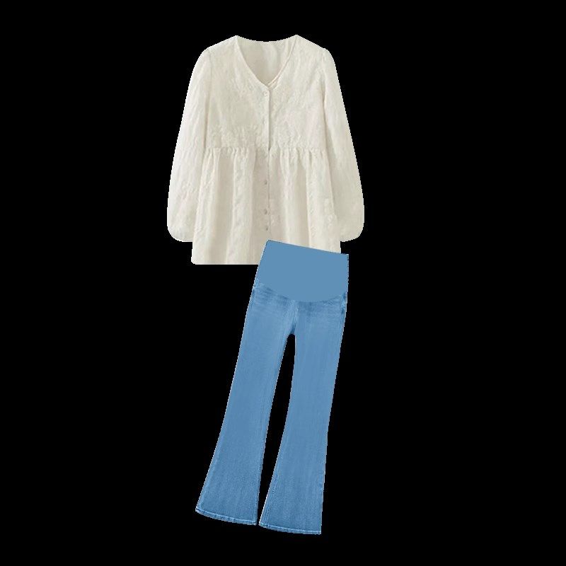 宽松牛仔裤 孕妇套装 洋气杏色v领蕾丝衬衫 韩版 两件套 春秋2025新款
