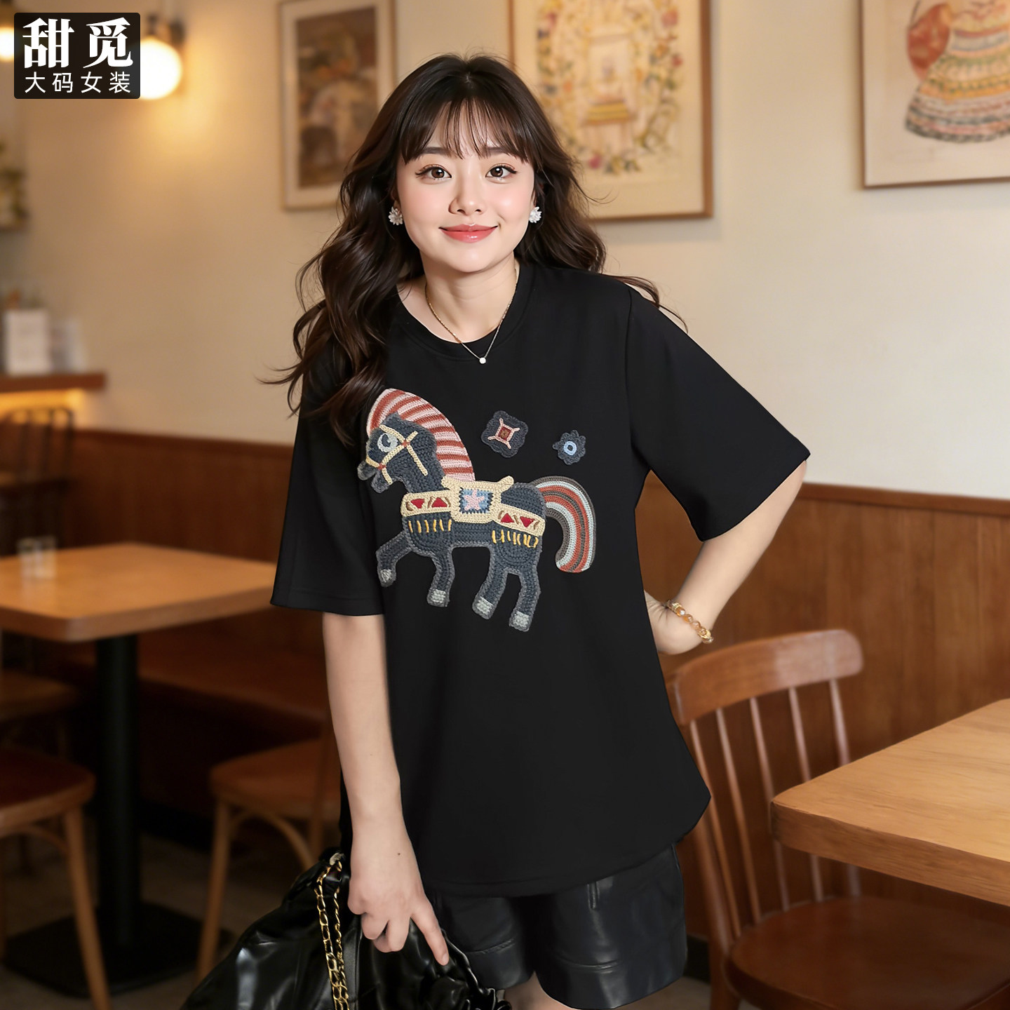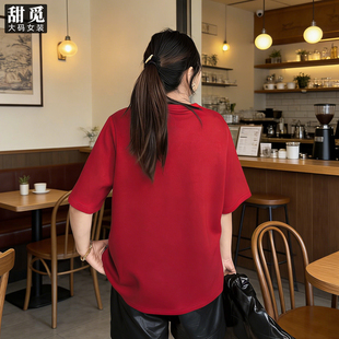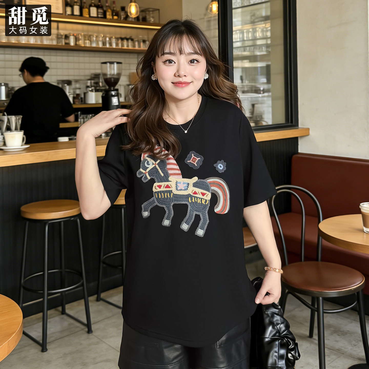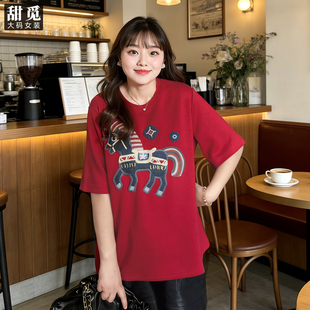 胖mm300斤时尚 春夏装 洋气小马绣花新年红色卫衣 女装 甜觅特大码