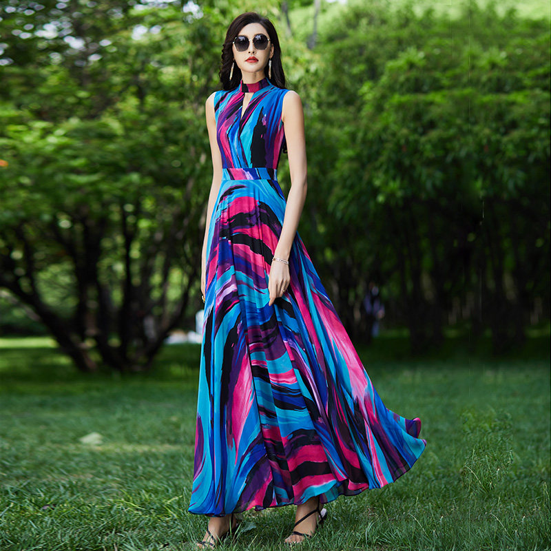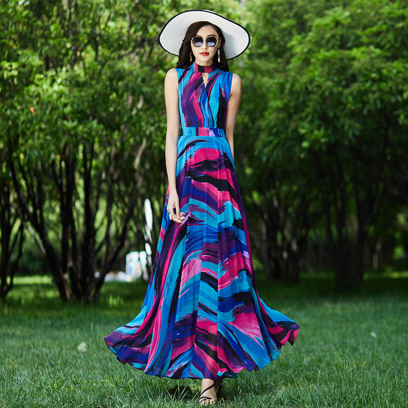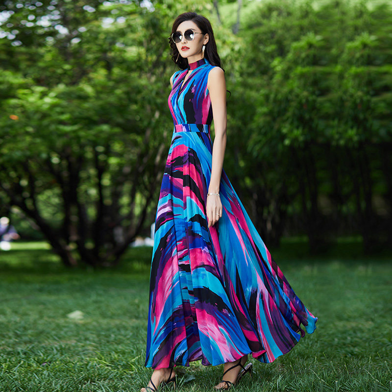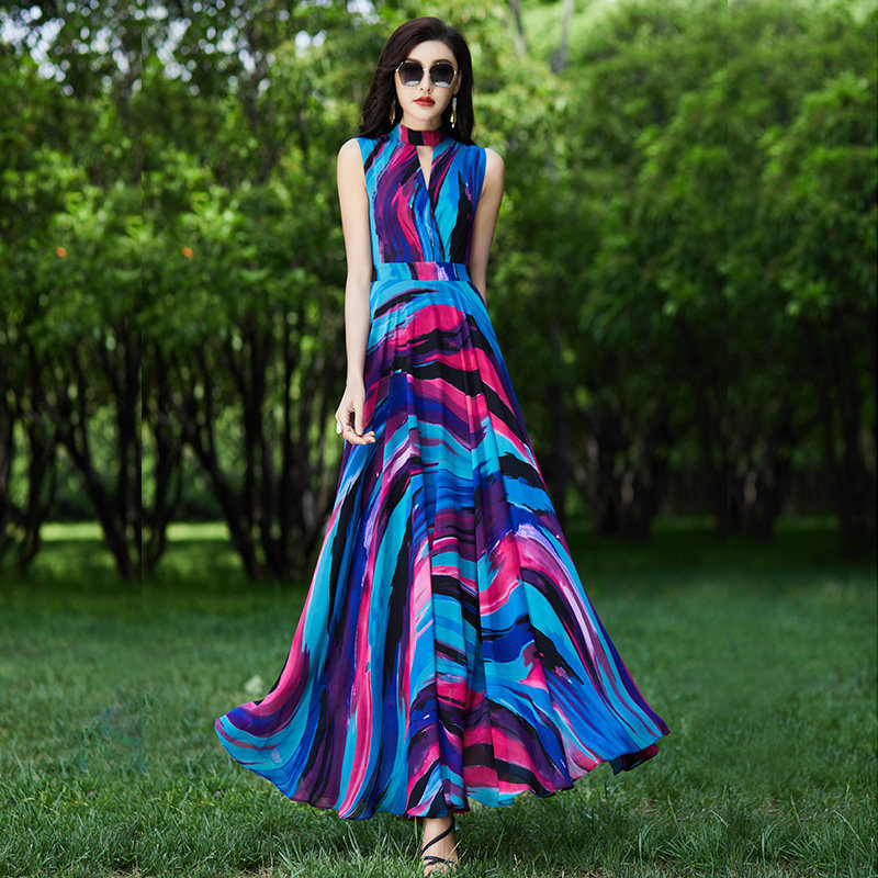雪纺印花连衣裙收腰2021新款 大摆沙滩长裙女到脚踝1389 夏显瘦无袖