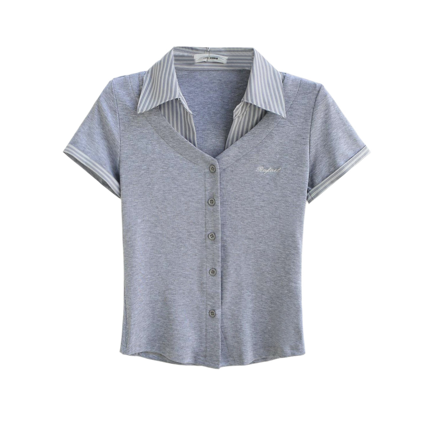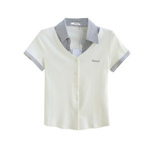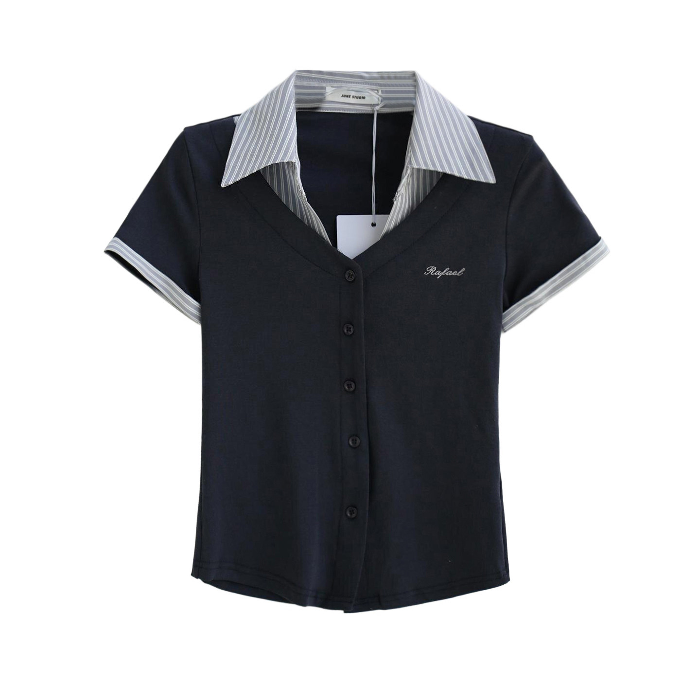 夏装 衬衫 新款 假两件刺绣V领条纹短袖 女上衣 韩系学院风短款 拾野森