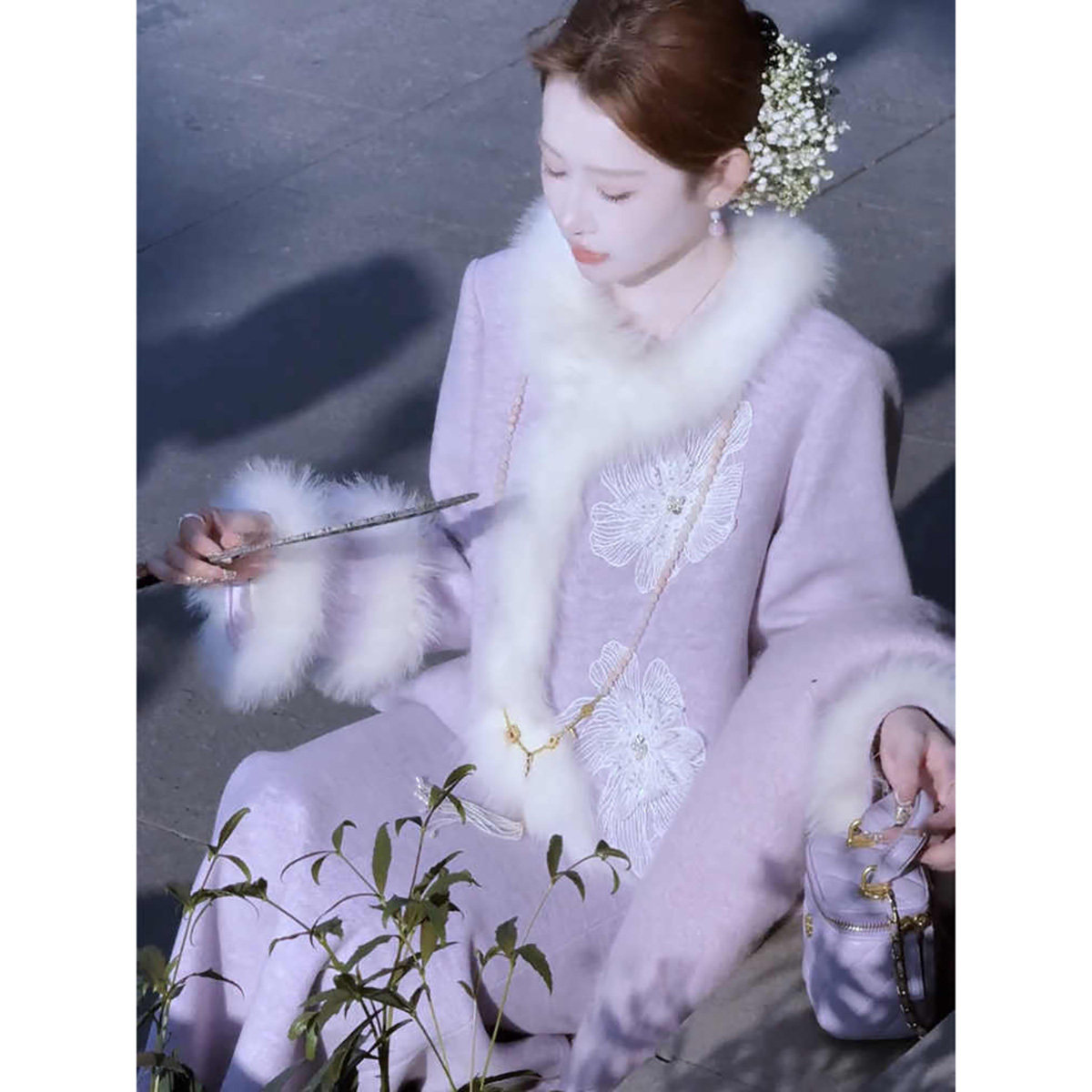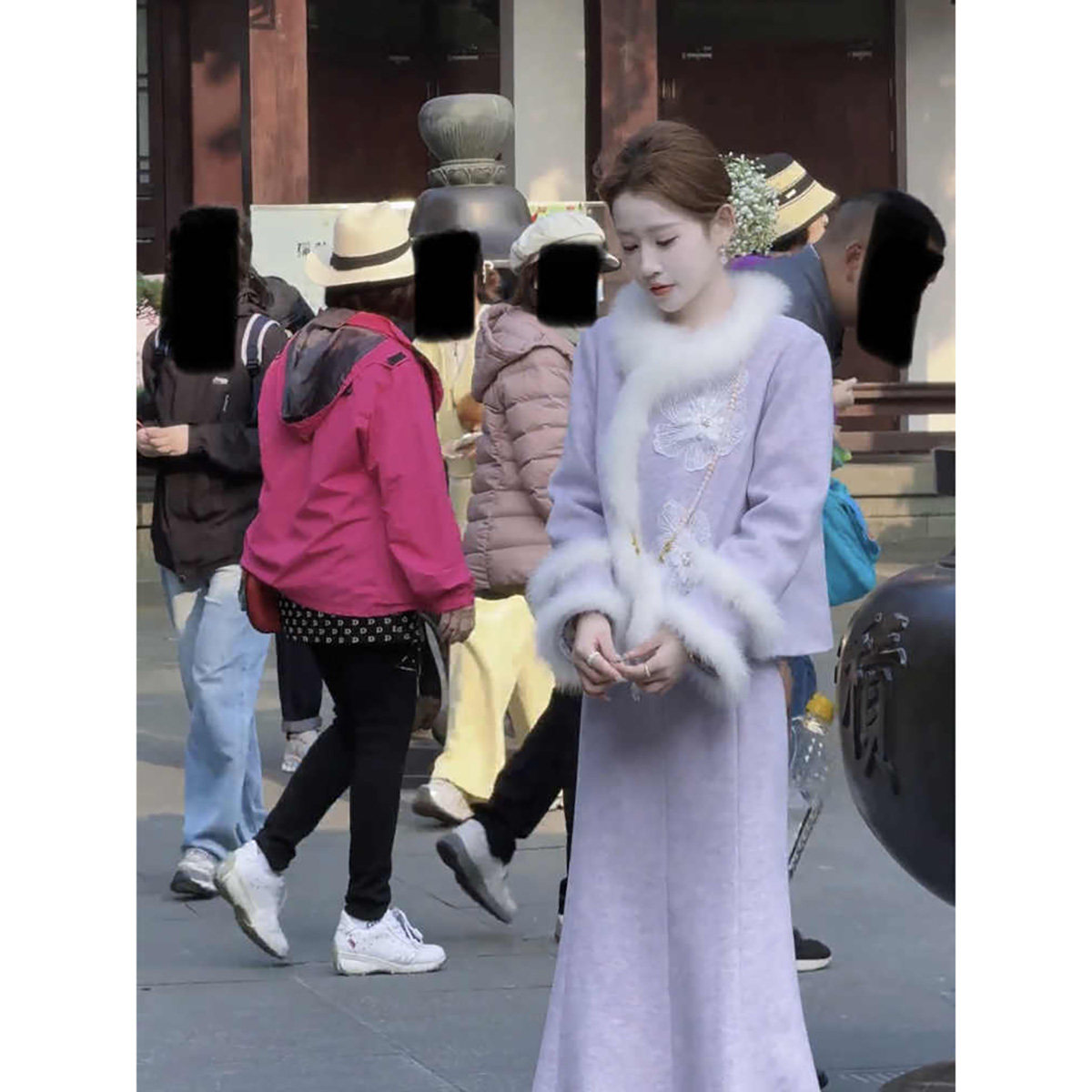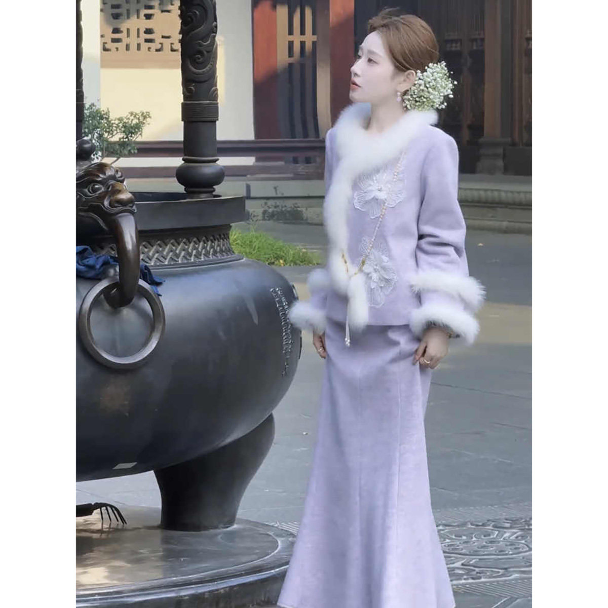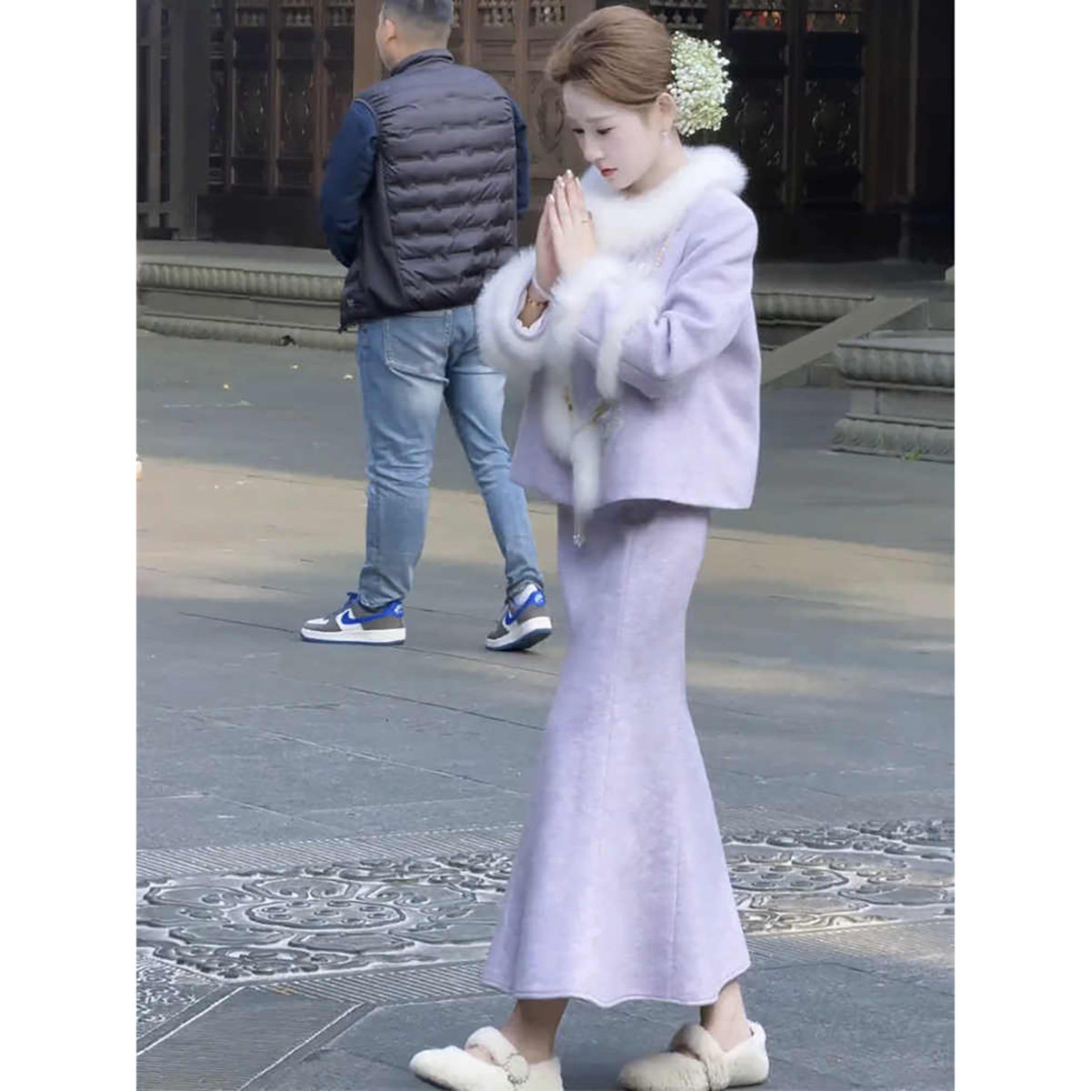 2026新中式 女冬千金风洋气毛边外套鱼尾裙气质百搭 风毛领呢子套装