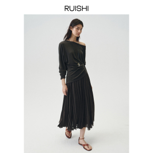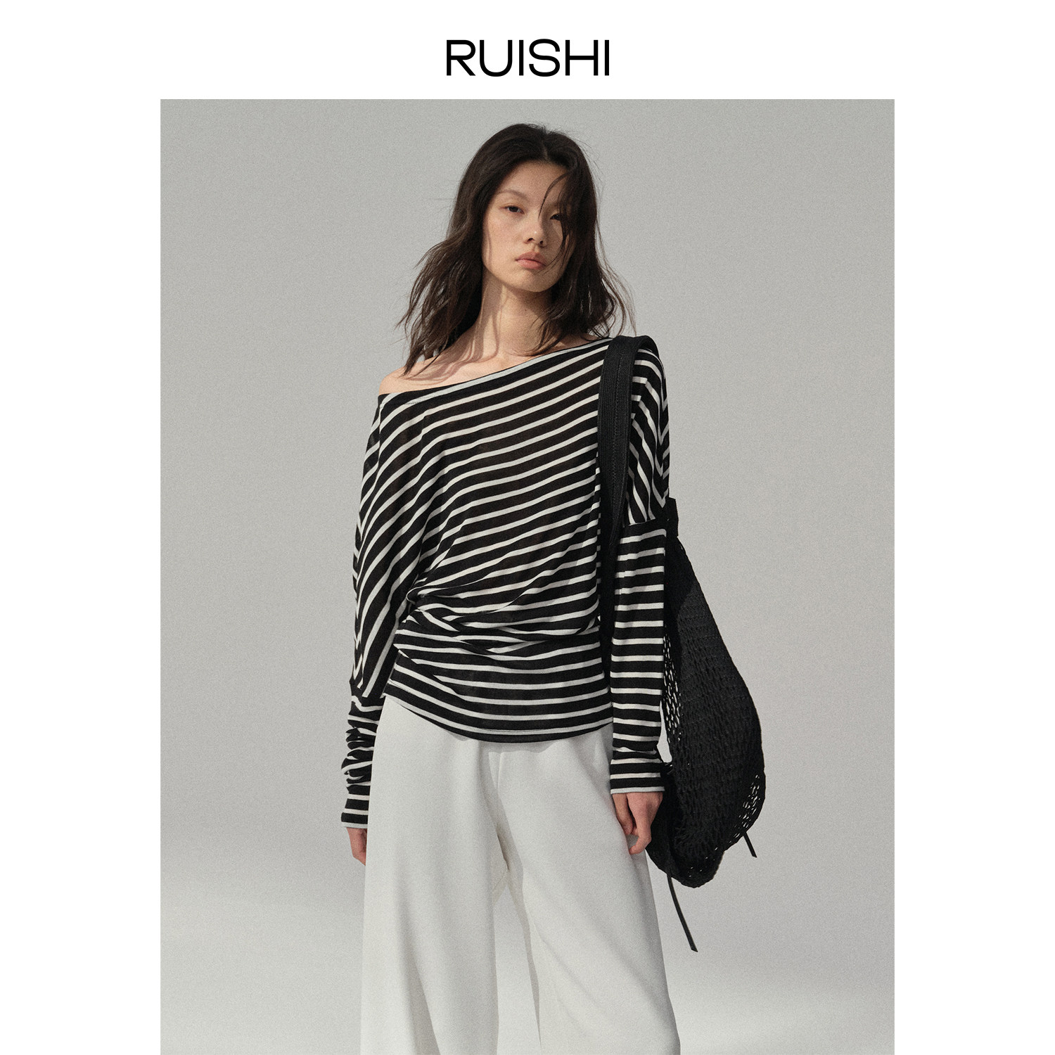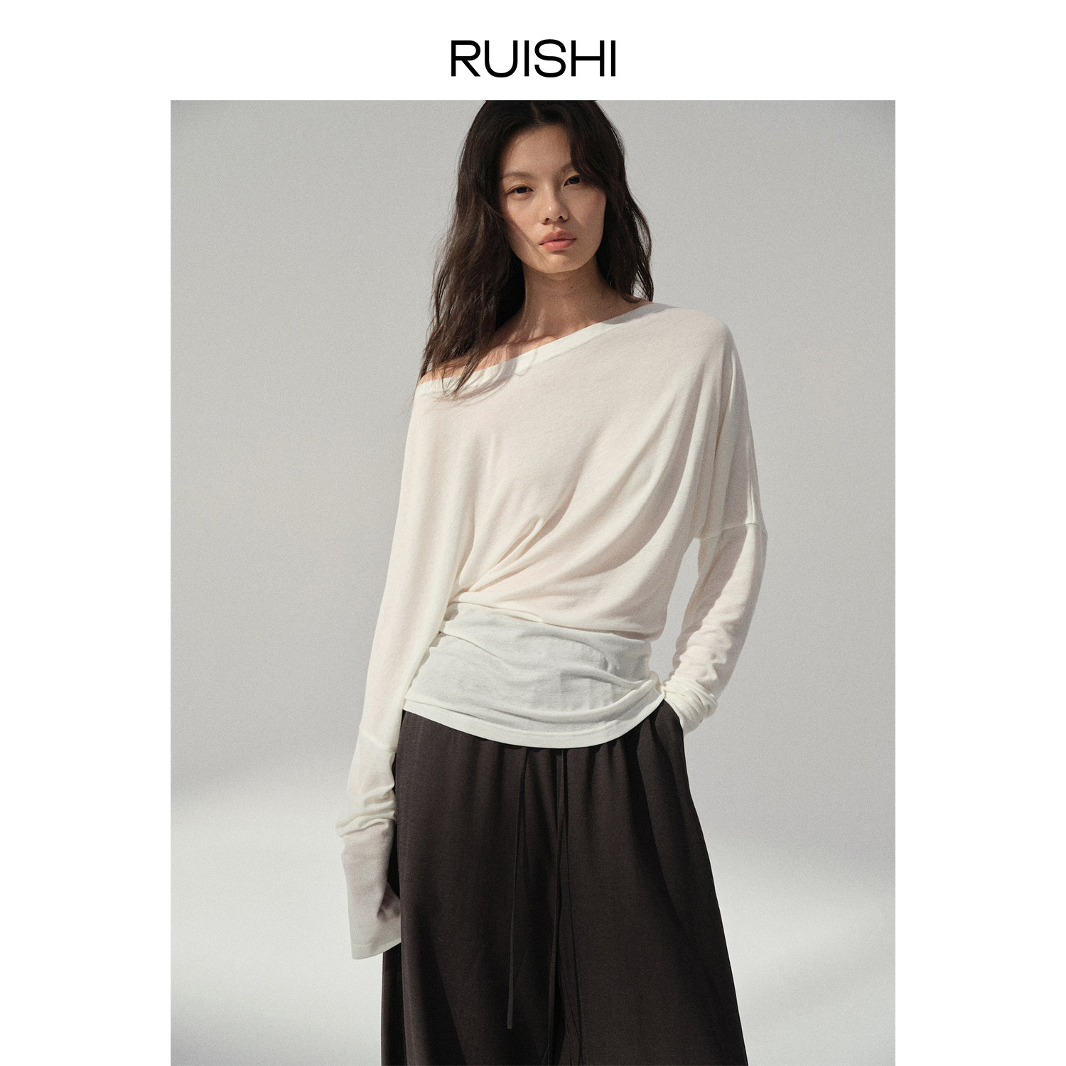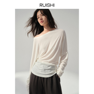 弹力斜肩收腰长袖 慵懒法式 T恤上衣女春夏 慵懒假日 RUISHI芮时