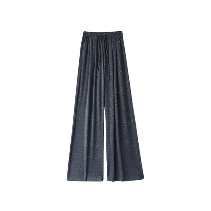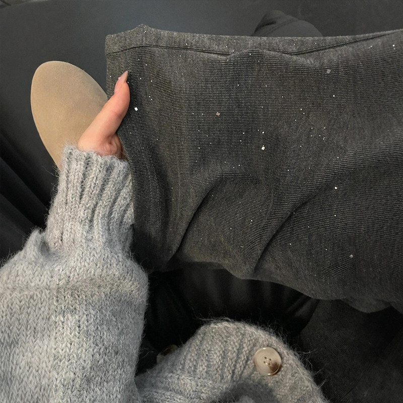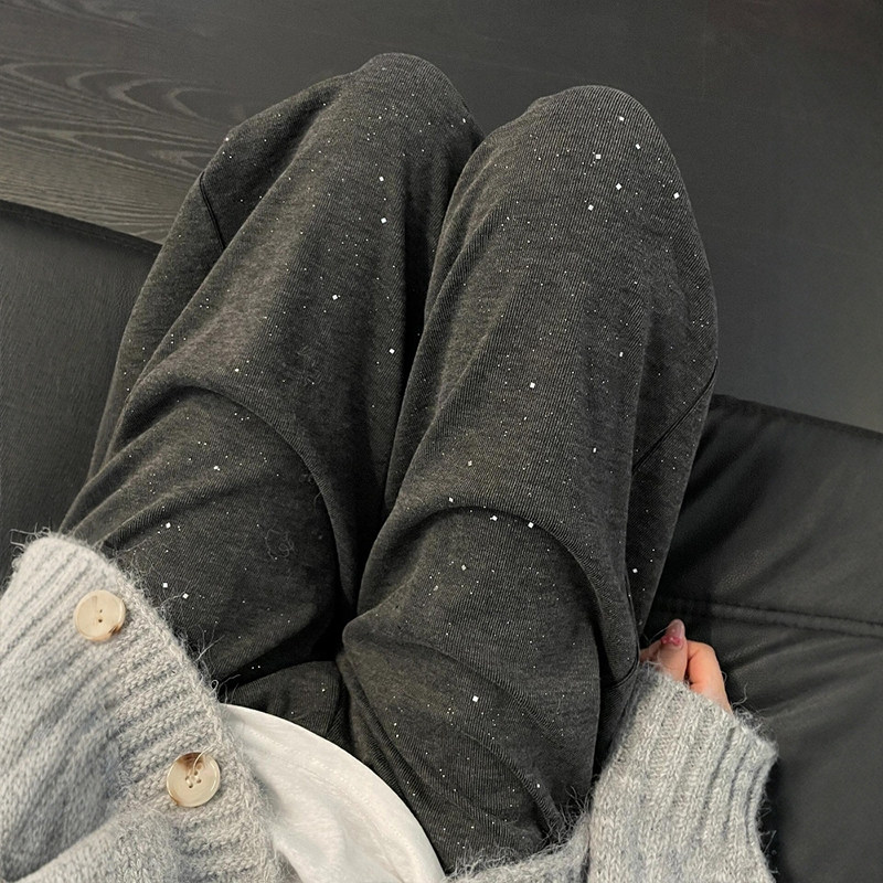 女胖mm显瘦宽松慵懒风休闲裤 秋冬深灰色亮片针织阔腿糯米裤 子大码