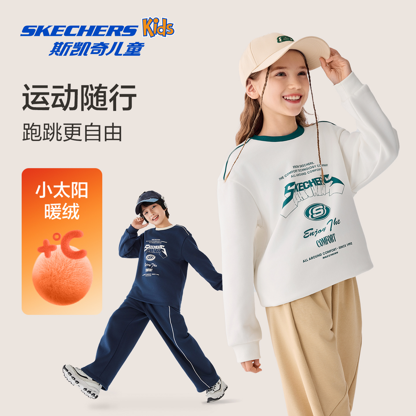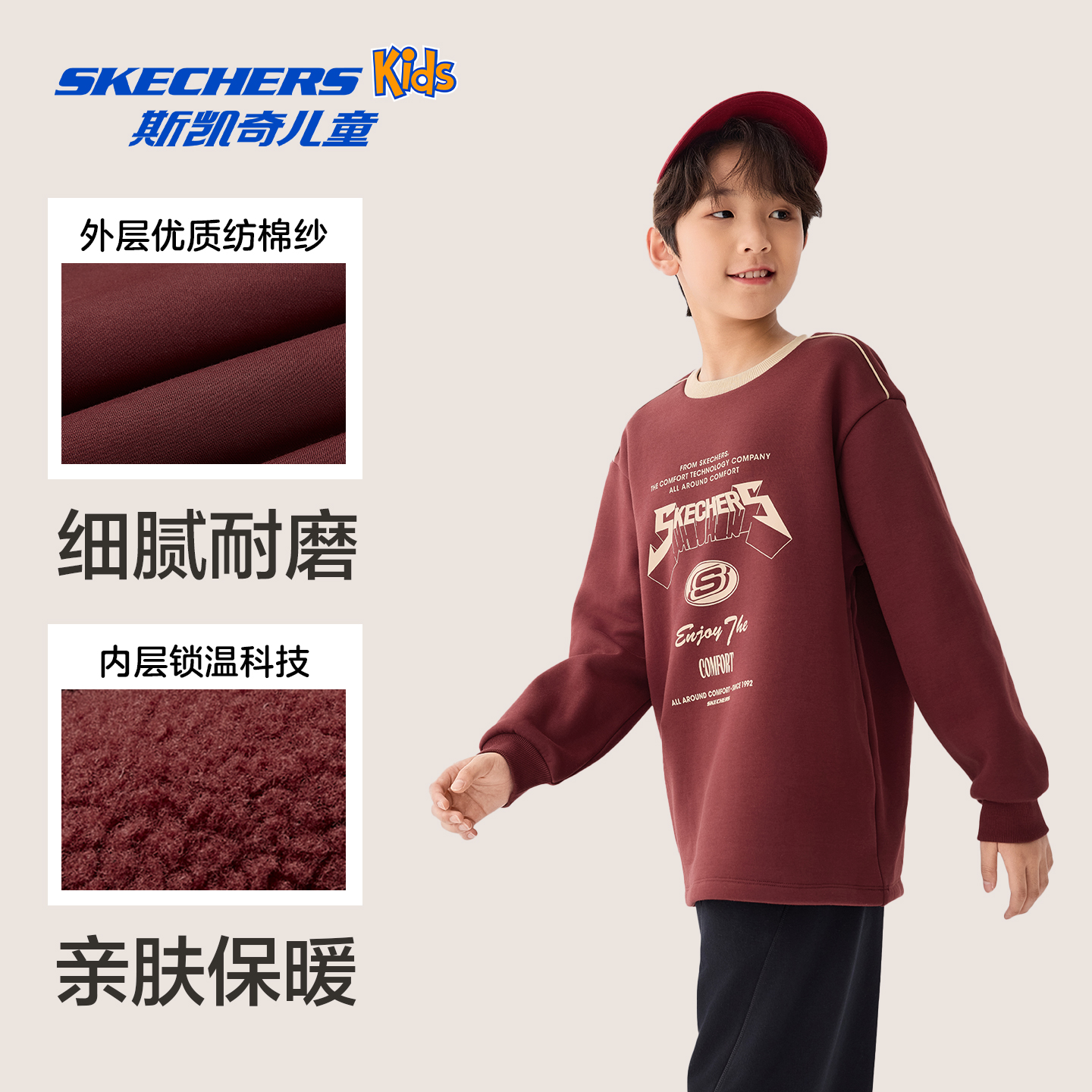 Skechers斯凯奇儿童针织套头卫衣秋冬男童加绒保暖复古百搭上衣