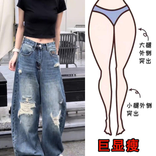 新款 梨形身材显瘦高腰拖地裤 大码 破洞弯刀阔腿牛仔裤 女装 2025秋季
