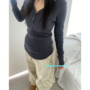 修身 T恤打底衫 V领内搭外穿百搭正肩上衣 单排扣长袖 eihey诶嘿新款