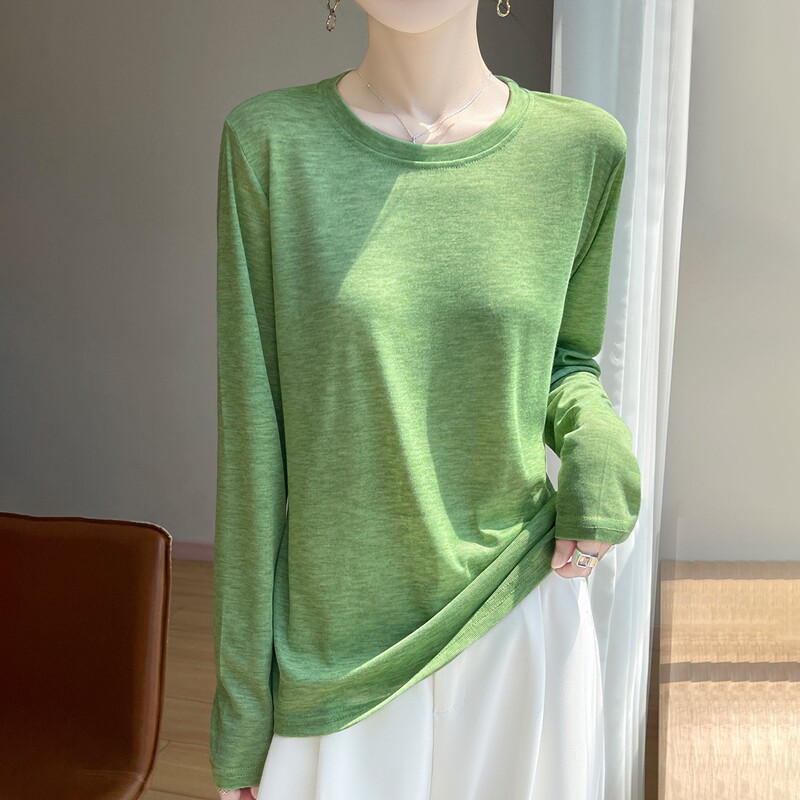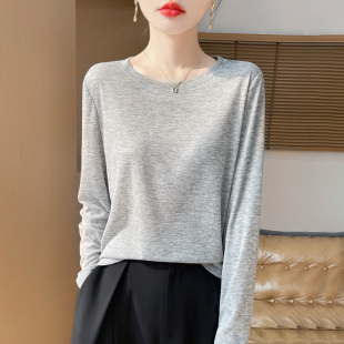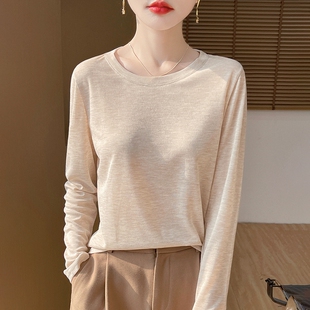 洋气T恤衫 女士圆领白色宽松套头打底内搭春夏季 精纺针织长袖 薄款