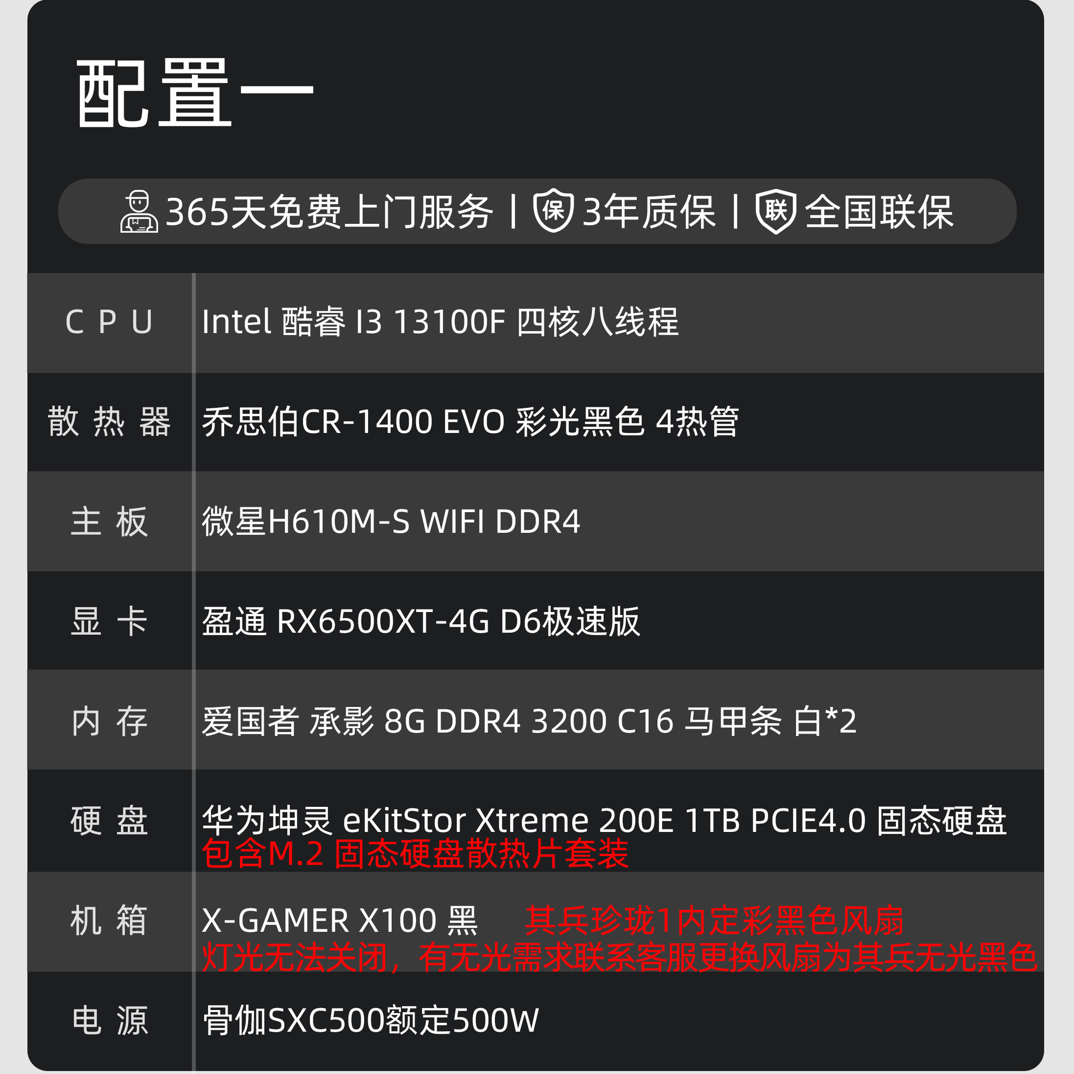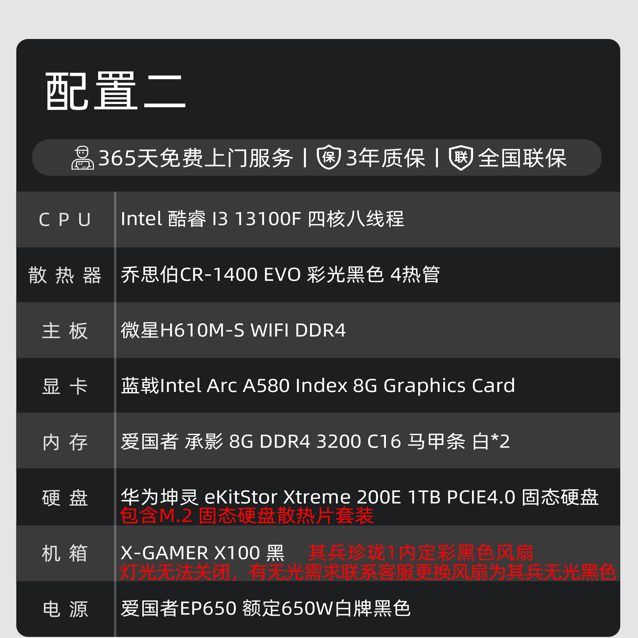 A580 2.4视频升级款 Arc RX6500XT 13100F游戏电脑主机 配置