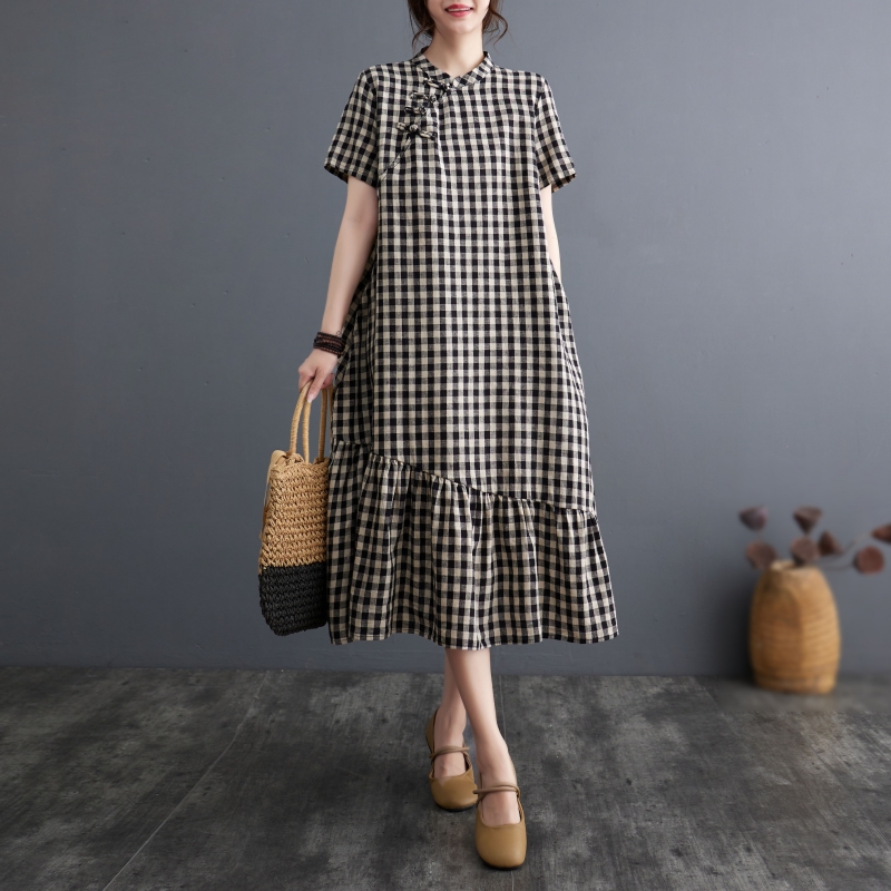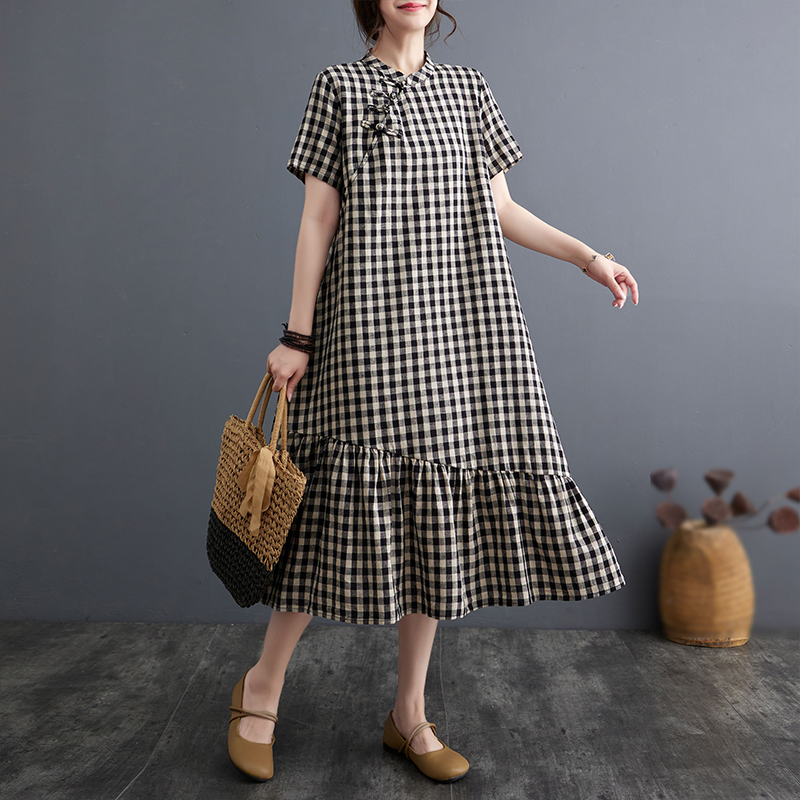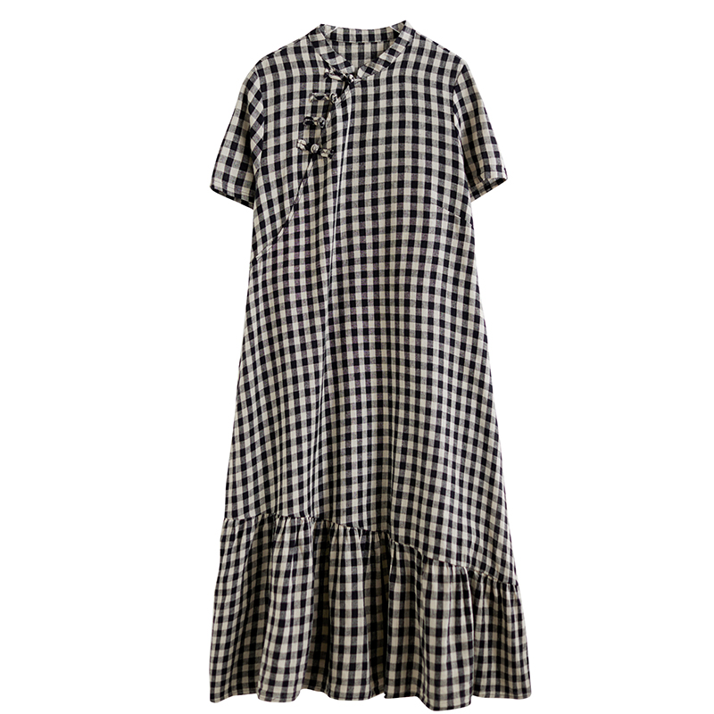 休闲气质中长款 宽松大码 过膝 复古格子盘扣棉麻连衣裙女夏季 新中式