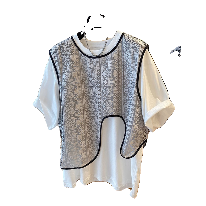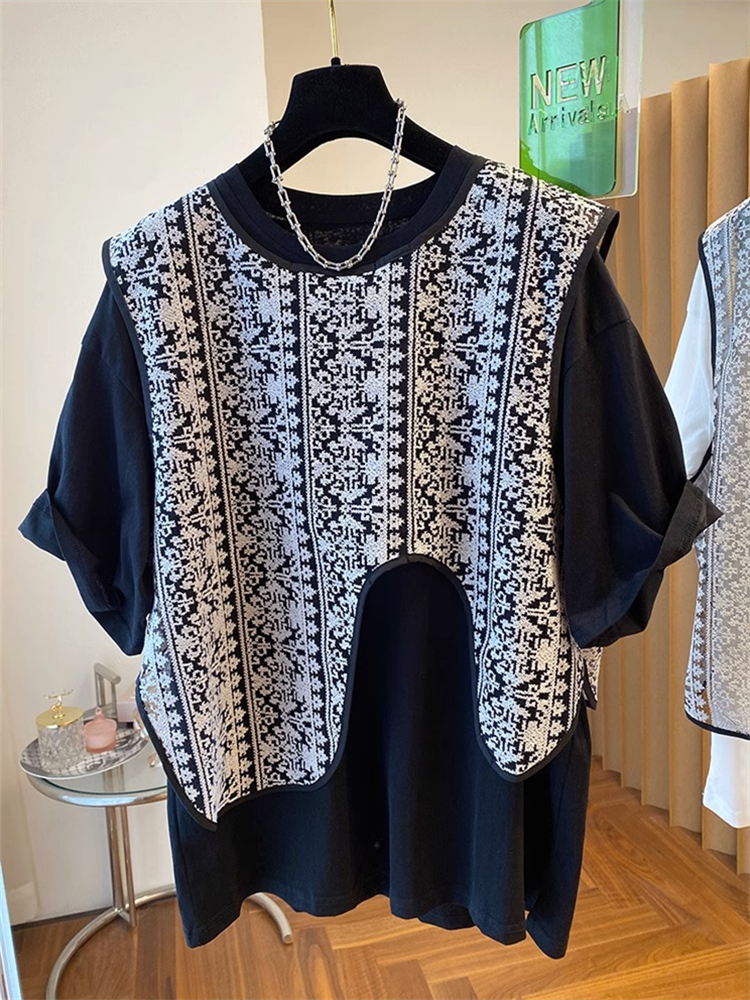 特大码 上衣 300斤小众设计刺绣不规则网纱马甲t恤两件套女胖MM大版