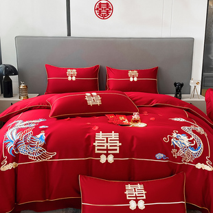 高档中式 喜字刺绣婚庆四件套大红色床单被套喜庆陪嫁结婚床上用品