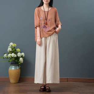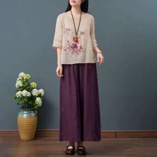 女夏季 棉麻圆领t恤套装 新款 新中式 两件套 时尚 国风阔腿裤 妈妈夏装