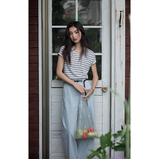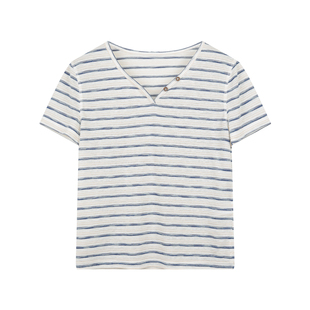 显瘦短袖 solighter 2025新款 复古莱赛尔v领条纹T恤女夏季 上衣 法式