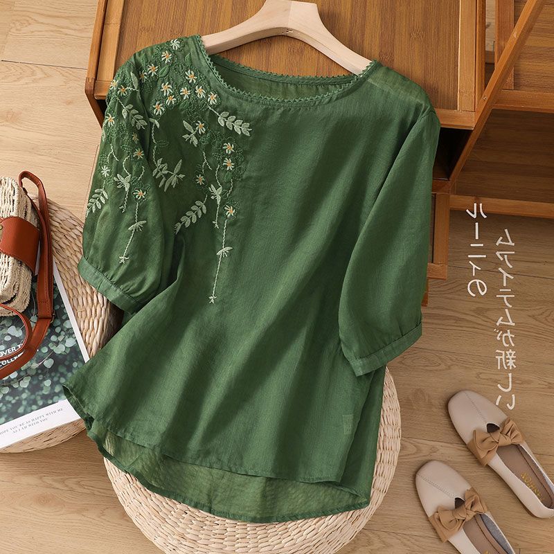 短袖 中年妈妈夏装 高端亚麻苎麻大码 薄款 T恤 棉麻刺绣上衣女士夏季
