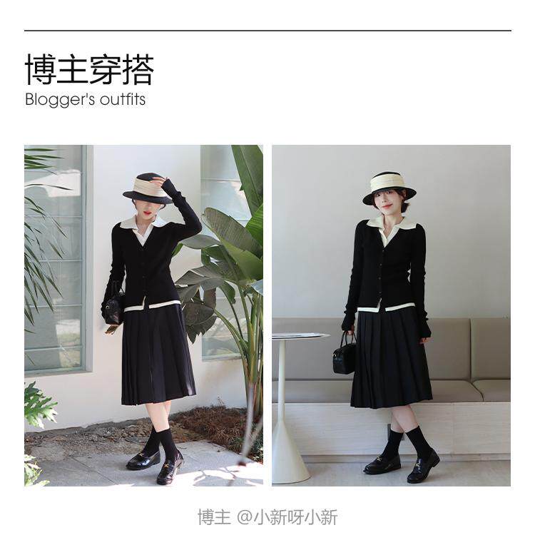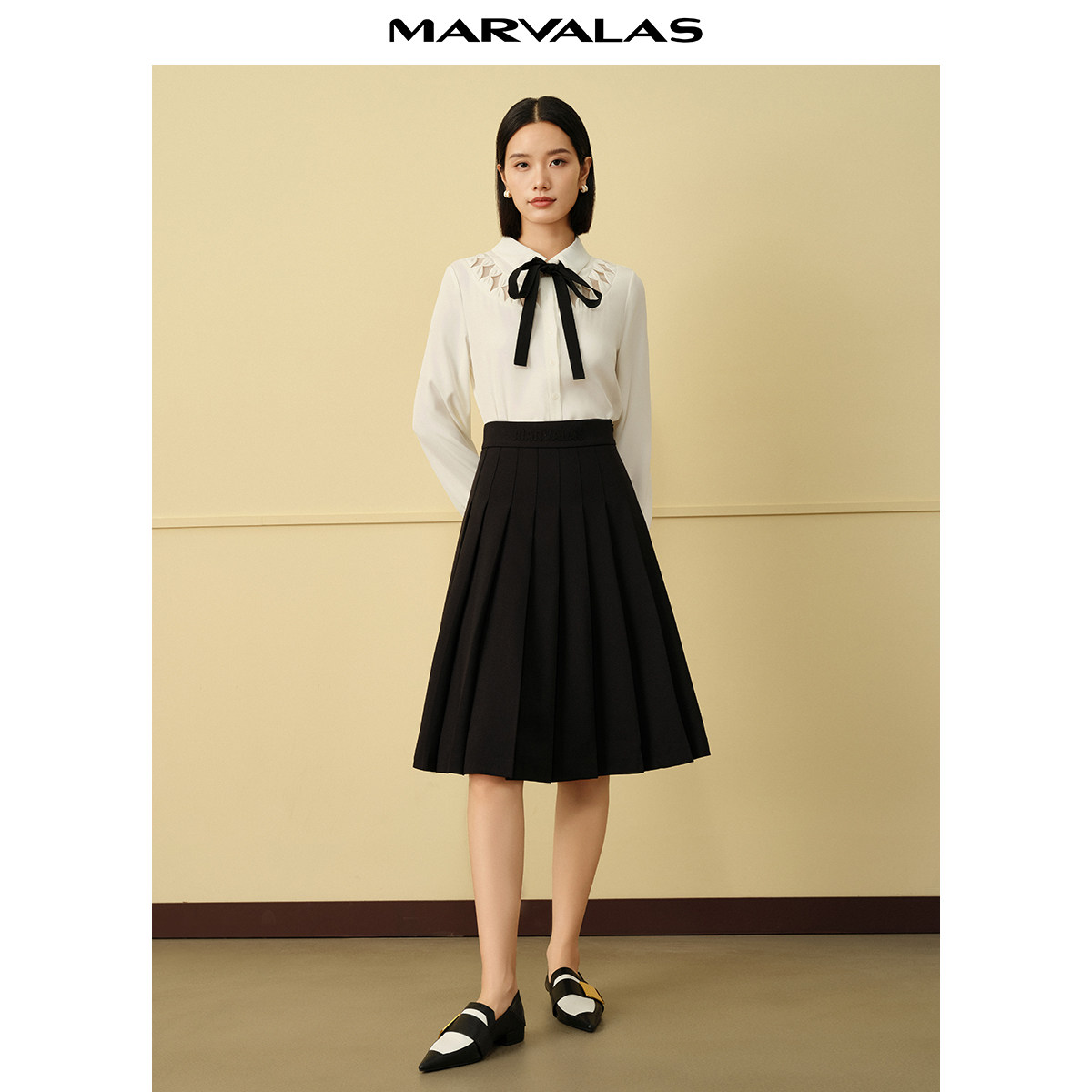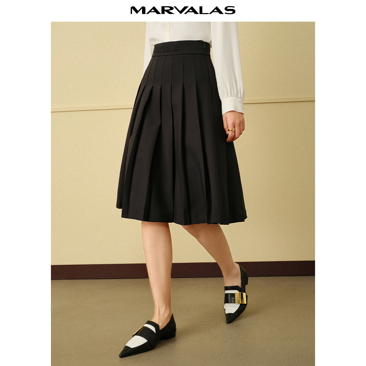 曼德诗纯色小黑裙压褶半身裙2026春季 高腰裙子女百褶OL中长裙 新品