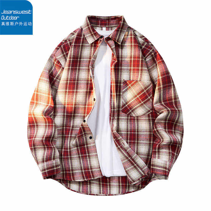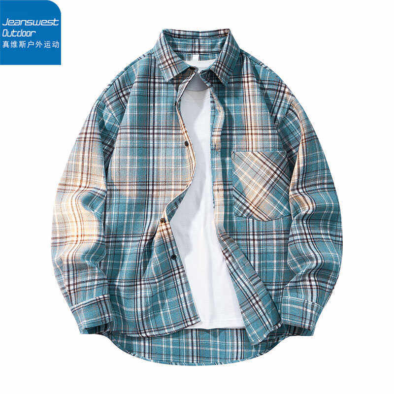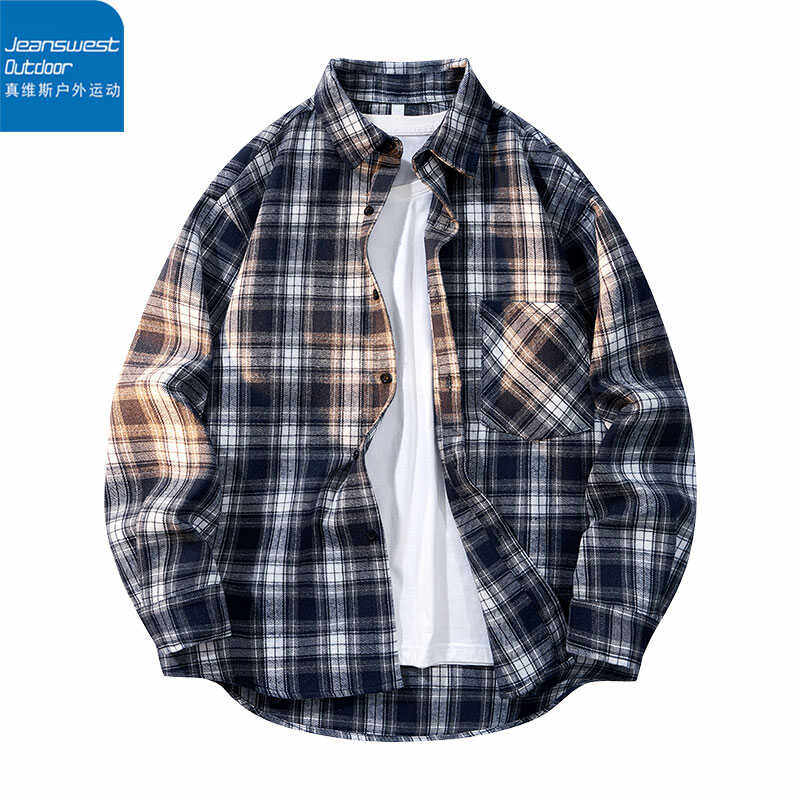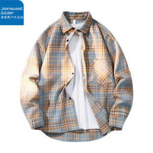托休闲衬衣潮 男宽松纯棉袖 真维斯户外运动文艺青年黑白格长袖 衬衫