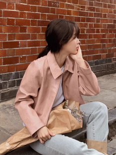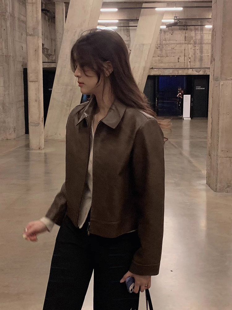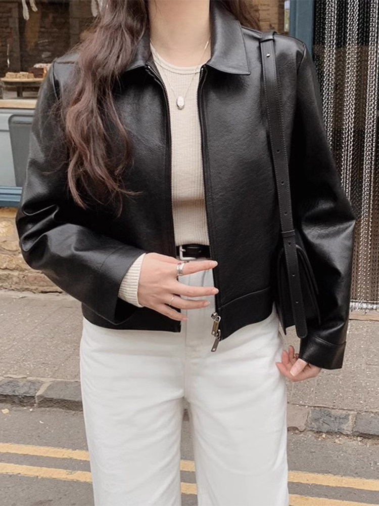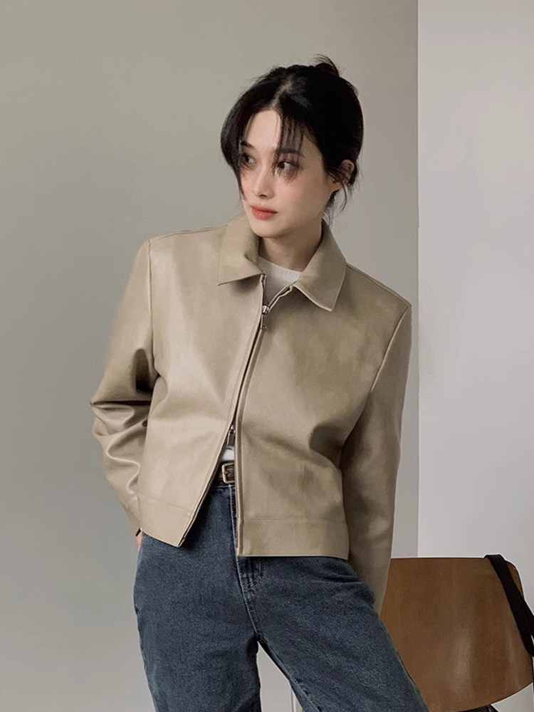 韩国chic秋季 PU皮衣夹克外套女 小众帅气翻领双拉链百搭小个子长袖